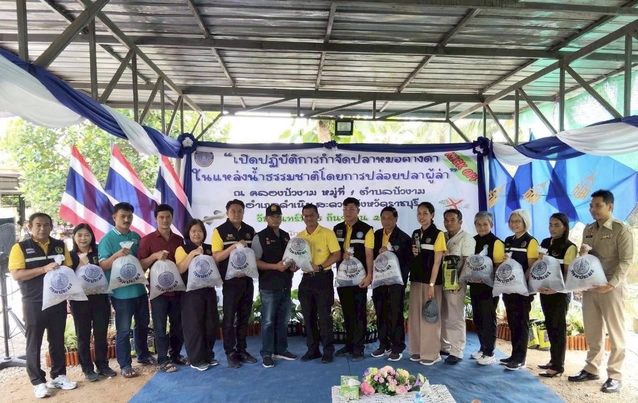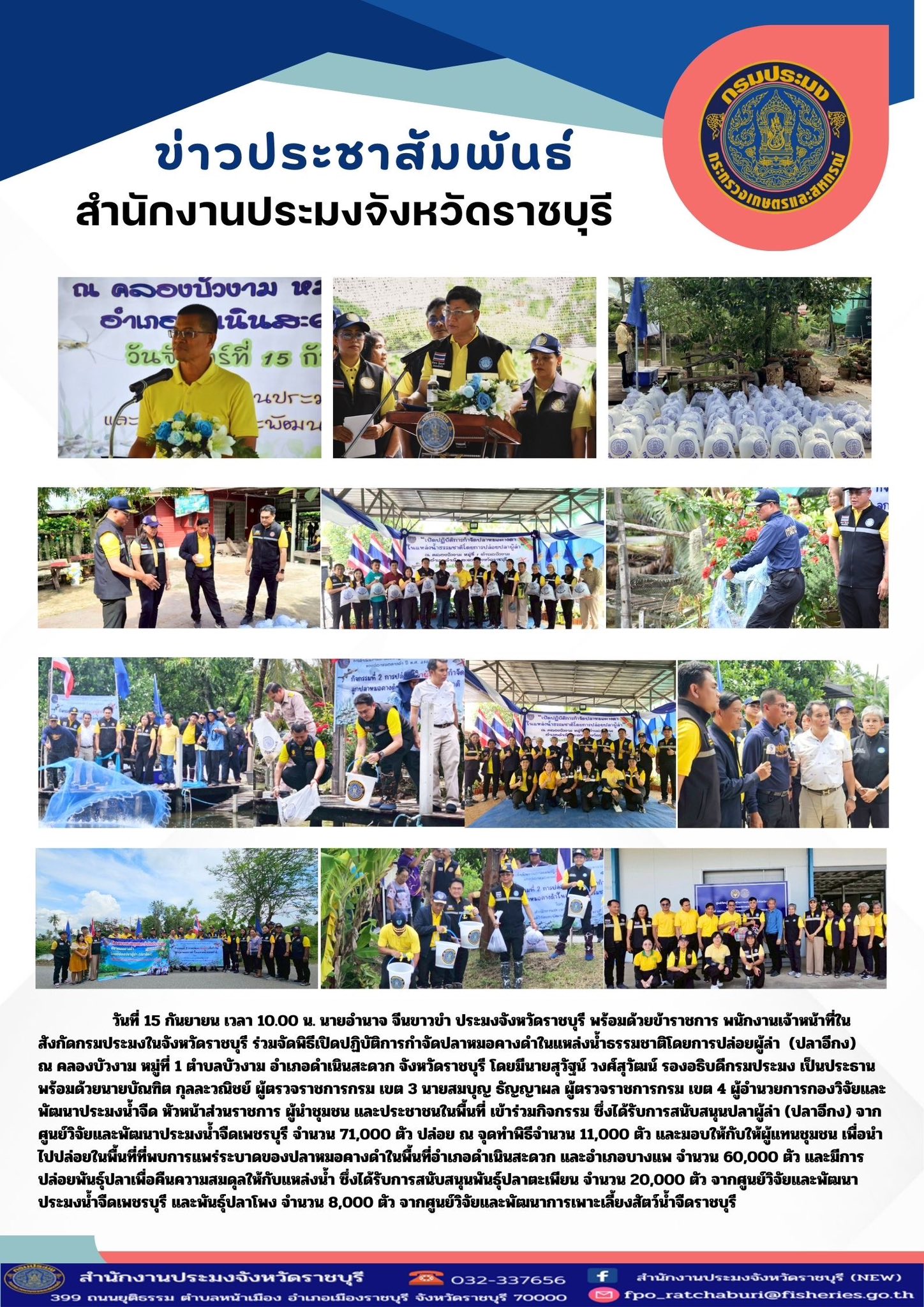 วันที่ 15 กันยายน เวลา 10.00 น. นายอำนาจ จีนขาวขำ ประมงจังหวัดราชบุรี พร้อมด้วยข้าราชการ พนักงานเจ้าหน้าที่ในสังกัดกรมประมงในจังหวัดราชบุรี ร่วมจัดพิธีเปิดปฏิบัติการกำจัดปลาหมอคางดำในแหล่งน้ำธรรมชาติโดยการปล่อยผู้ล่า (ปลาอีกง) ณ คลองบัวงาม หมู่ที่ 1 ตำบลบัวงาม อำเภอดำเนินสะดวก จังหวัดราชบุรี โดยมีนายสุวัฐน์ วงศ์สุวัฒน์ รองอธิบดีกรมประมง เป็นประธาน พร้อมด้วยนายบัณฑิต กุลละวณิชย์ ผู้ตรวจราชการกรม เขต 3 นายสมบุญ ธัญญาผล ผู้ตรวจราชการกรม เขต 4 ผู้อำนวยการกองวิจัยและพัฒนาประมงน้ำจืด หัวหน้าส่วนราชการ ผู้นำชุมชน และประชาชนในพื้นที่ เข้าร่วมกิจกรรม ซึ่งได้รับการสนับสนุนปลาผู้ล่า (ปลาอีกง) จากศูนย์วิจัยและพัฒนาประมงน้ำจืดเพชรบุรี จำนวน 71,000 ตัว ปล่อย ณ จุดทำพิธี จำนวน 11,000 ตัว และมอบให้กับให้ผู้แทนชุมชน เพื่อนำไปปล่อยในพื้นที่ที่พบการแพร่ระบาดของปลาหมอคางดำในพื้นที่อำเภอดำเนินสะดวก และอำเภอบางแพ จำนวน 60,000 ตัว และมีการปล่อยพันธุ์ปลาเพื่อคืนความสมดุลให้กับแหล่งน้ำ ซึ่งได้รับการสนับสนุนพันธุ์ปลาตะเพียน จำนวน 20,000 ตัว จากศูนย์วิจัยและพัฒนาประมงน้ำจืดเพชรบุรี และพันธุ์ปลาโพง จำนวน 8,000 ตัว จากศูนย์วิจัยและพัฒนาการเพาะเลี้ยงสัตว์น้ำจืดราชบุรี