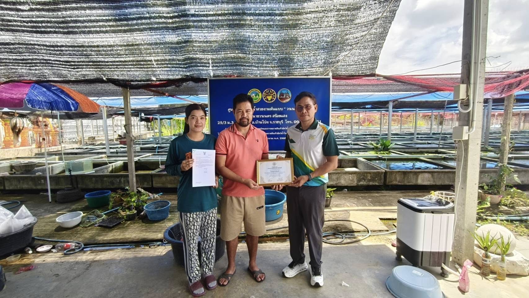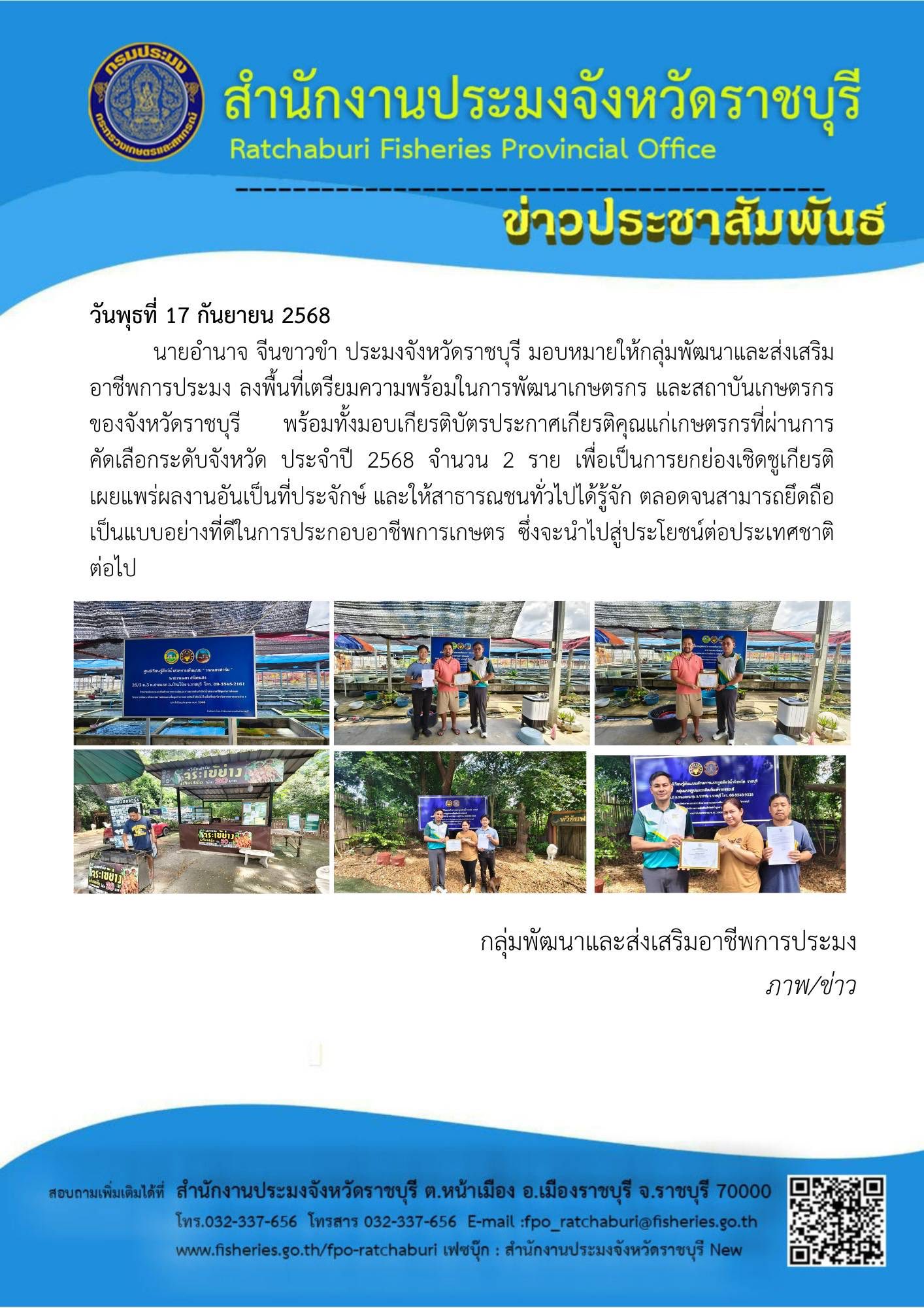 วันพุธที่ 17 กันยายน 2568 นายอำนาจ จีนขาวขำ ประมงจังหวัดราชบุรี มอบหมายให้เจ้าหน้าที่กลุ่มพัฒนาและส่งเสริมอาชีพการประมง ลงพื้นที่ติดตามเกษตรกรที่เข้าร่วมการคัดเลือกเกษตรกรและสถาบันเกษตรกรดีเด่นด้านการประมง ประจำปี 2568 ณ อำเภอปากท่อ และอำเภอบ้านโป่ง จังหวัดราชบุรี พร้อมทั้งมอบเกียรติบัตรประกาศเกียรติคุณแก่เกษตรกรและสถาบันเกษตรกรที่ได้รับการคัดเลือกระดับจังหวัด จำนวน 2 ราย เพื่อเป็นการยกย่องเชิดชูเกียรติ เผยแพร่ผลงานอันเป็นที่ประจักษ์ และให้สาธารณชนทั่วไปได้รู้จัก ตลอดจนสามารถยึดถือเป็นแบบอย่างที่ดีในการประกอบอาชีพการเกษตร ซึ่งจะนำไปสู่ประโยชน์ต่อประเทศชาติในภาพรวมต่อไป