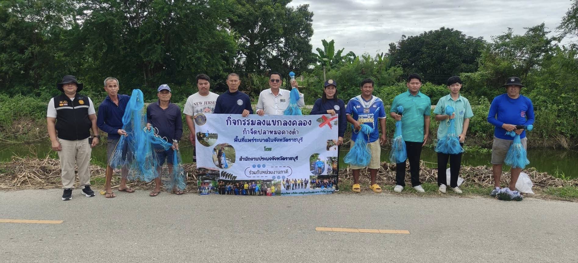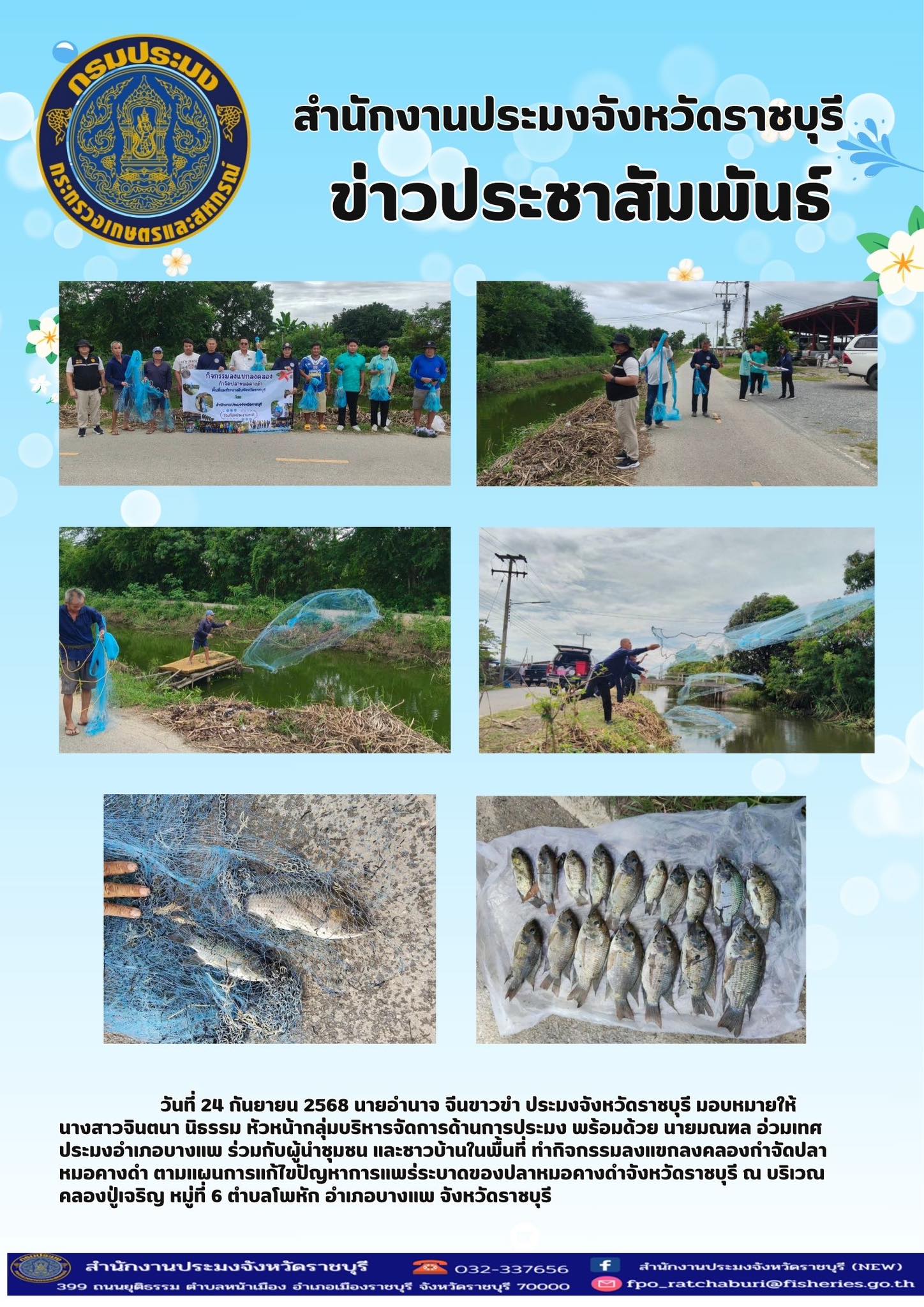 วันที่ 24 กันยายน 2568 นายอำนาจ จีนขาวขำ ประมงจังหวัดราชบุรี มอบหมายให้ นางสาวจินตนา นิธรรม หัวหน้ากลุ่มบริหารจัดการด้านการประมง พร้อมด้วย นายมณฑล อ่วมเทศ ประมงอำเภอบางแพ ร่วมกับผู้นำชุมชน และชาวบ้านในพื้นที่ ทำกิจกรรมลงแขกลงคลองกำจัดปลาหมอคางดำ ตามแผนการแก้ไขปัญหาการแพร่ระบาดของปลาหมอคางดำจังหวัดราชบุรี ณ บริเวณคลองปู่เจริญ หมู่ที่ 6 ตำบลโพหัก อำเภอบางแพ จังหวัดราชบุรี