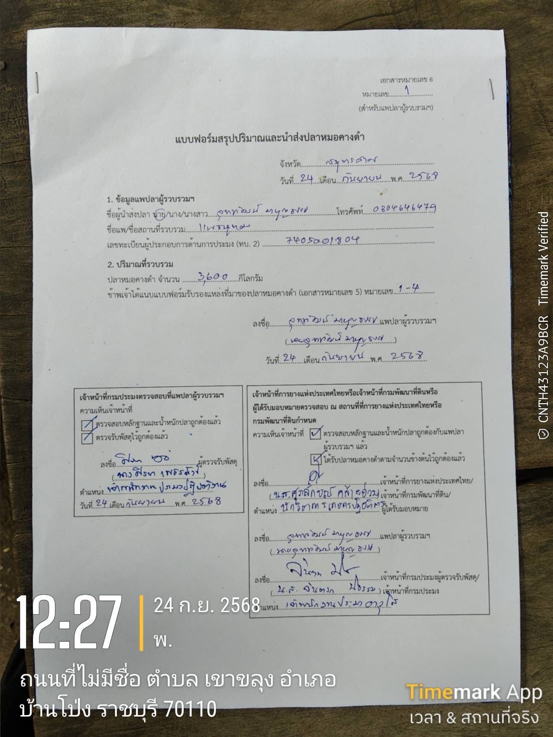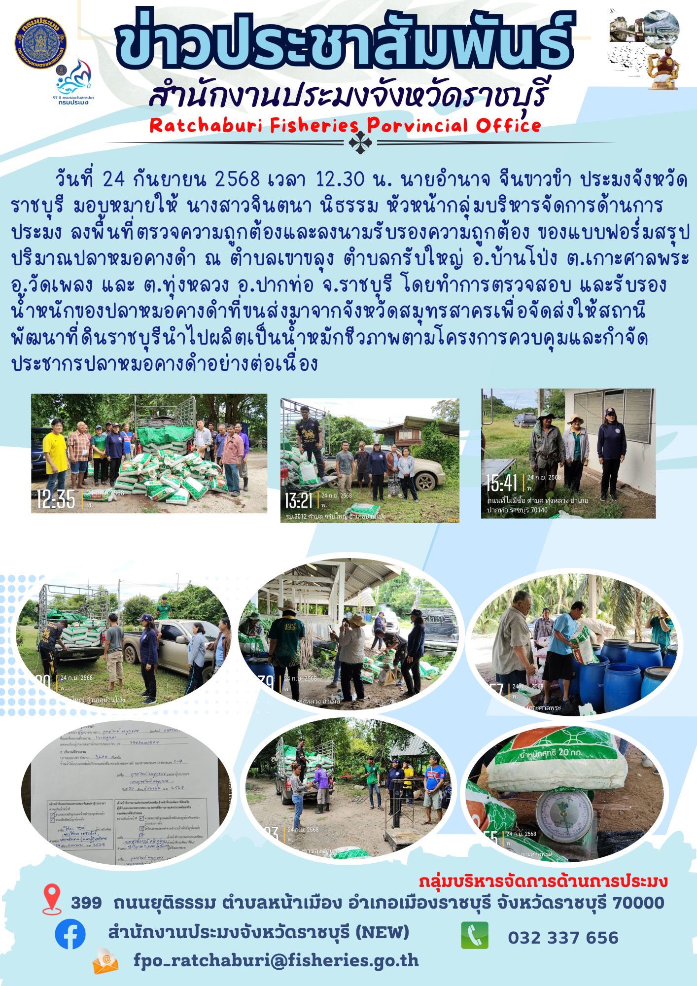 วันที่ 24 กันยายน 2568 เวลา 12.30 น. นายอำนาจ จีนขาวขำ ประมงจังหวัดราชบุรี มอบหมายให้ นางสาวจินตนา นิธรรม หัวหน้ากลุ่มบริหารจัดการด้านการประมง ลงพื้นที่ตรวจความถูกต้องและลงนามรับรองความถูกต้อง ของแบบฟอร์มสรุปปริมาณปลาหมอคางดำ ณ ตำบลเขาขลุง ตำบลกรับใหญ่ อ.บ้านโป่ง ต.เกาะศาลพระ อ.วัดเพลง และ ต.ทุ่งหลวง อ.ปากท่อ จ.ราชบุรี โดยทำการตรวจสอบ และรับรองน้ำหนักของปลาหมอคางดำที่ขนส่งมาจากจังหวัดสมุทรสาครเพื่อจัดส่งให้สถานีพัฒนาที่ดินราชบุรีนำไปผลิตเป็นน้ำหมักชีวภาพตามโครงการควบคุมและกำจัดประชากรปลาหมอคางดำอย่างต่อเนื่อง