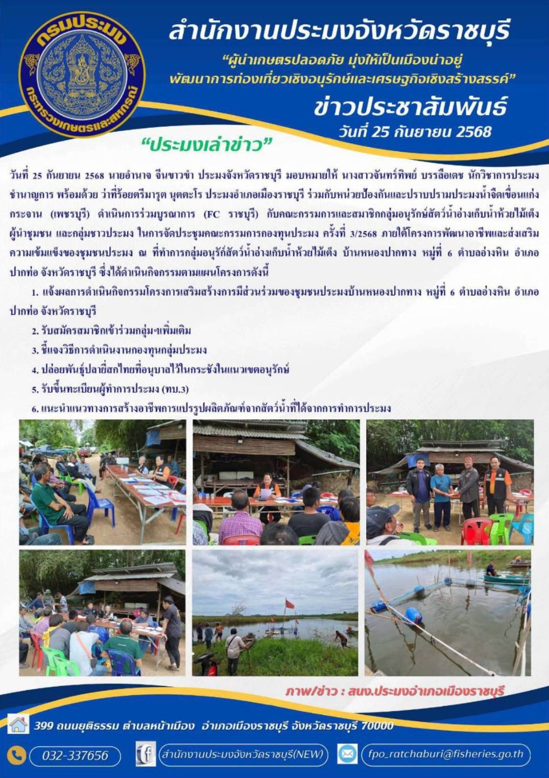 วันที่ 25 กันยายน 2568 นายอำนาจ จีนขาวขำ ประมงจังหวัดราชบุรี มอบหมายให้ นางสาวจันทร์ทิพย์ บรรลือเดช นักวิชาการประมงชำนาญการ พร้อมด้วย ว่าที่ร้อยตรีมารุต นุตตะโร ประมงอำเภอเมืองราชบุรี ร่วมกับหน่วยป้องกันและปราบปรามประมงน้ำจืด เขื่อนแก่งกระจาน (เพชรบุรี) ดำเนินการร่วมบูรณาการ (FC ราชบุรี) กับคณะกรรมการ และสมาชิกกลุ่มอนุรักษ์สัตว์น้ำอ่างเก็บน้ำห้วยไม้เต็ง ผู้นำชุมชน และกลุ่มชาวประมง ในการจัดประชุมคณะกรรมการกองทุนประมง ครั้งที่ 3/2568 ภายใต้โครงการพัฒนา อาชีพและส่งเสริมความเข้มแข็งของชุมชนประมง ณ ที่ทำการกลุ่มอนุรัก์สัตว์น้ำ อ่างเก็บน้ำห้วยไม้เต็ง บ้านหนองปากทาง หมู่ที่ 6 ตำบลอ่างหิน อำเภอปากท่อ จังหวัดราชบุรี ซึ่งได้ดำเนินกิจกรรมตามแผนโครงการดังนี้