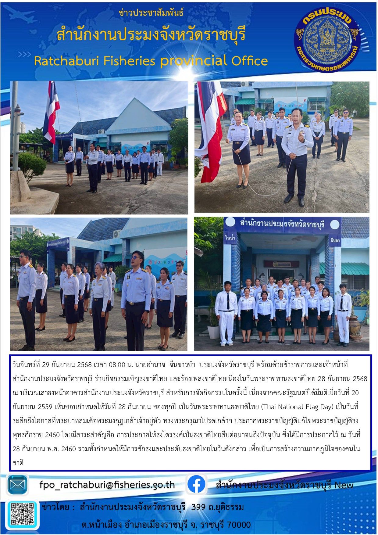 วันจันทร์ที่ 29 กันยายน 2568 เวลา 08.00 น. นายอำนาจ จีนขาวขำ ประมงจังหวัดราชบุรี พร้อมด้วยข้าราชการและเจ้าหน้าที่สำนักงานประมงจังหวัดราชบุรี ร่วมกิจกรรมเชิญธงชาติไทย และร้องเพลงชาติไทยเนื่องในวันพระราชทานธงชาติไทย 28 กันยายน 2568 ณ บริเวณเสาธงหน้าอาคารสำนักงานประมงจังหวัดราชบุรี สำหรับการจัดกิจกรรมในครั้งนี้ เนื่องจากคณะรัฐมนตรีได้มีมติเมื่อวันที่ 20 กันยายน 2559 เห็นชอบกำหนดให้วันที่ 28 กันยายน ของทุกปี เป็นวันพระราชทานธงชาติไทย (Thai National Flag Day) เป็นวันที่ระลึกถึงโอกาสที่พระบาทสมเด็จพระมงกุฎเกล้าเจ้าอยู่หัว ทรงพระกรุณาโปรดเกล้าฯ ประกาศพระราชบัญญัติแก้ไขพระราชบัญญัติธง พุทธศักราช 2460 โดยมีสาระสำคัญคือ การประกาศให้ธงไตรรงค์เป็นธงชาติไทยสืบต่อมาจนถึงปัจจุบัน ซึ่งได้มีการประกาศไว้ ณ วันที่ 28 กันยายน พ.ศ. 2460 รวมทั้งกำหนดให้มีการชักธงและประดับธงชาติไทยในวันดังกล่าว เพื่อเป็นการสร้างความภาคภูมิใจของคนในชาติ