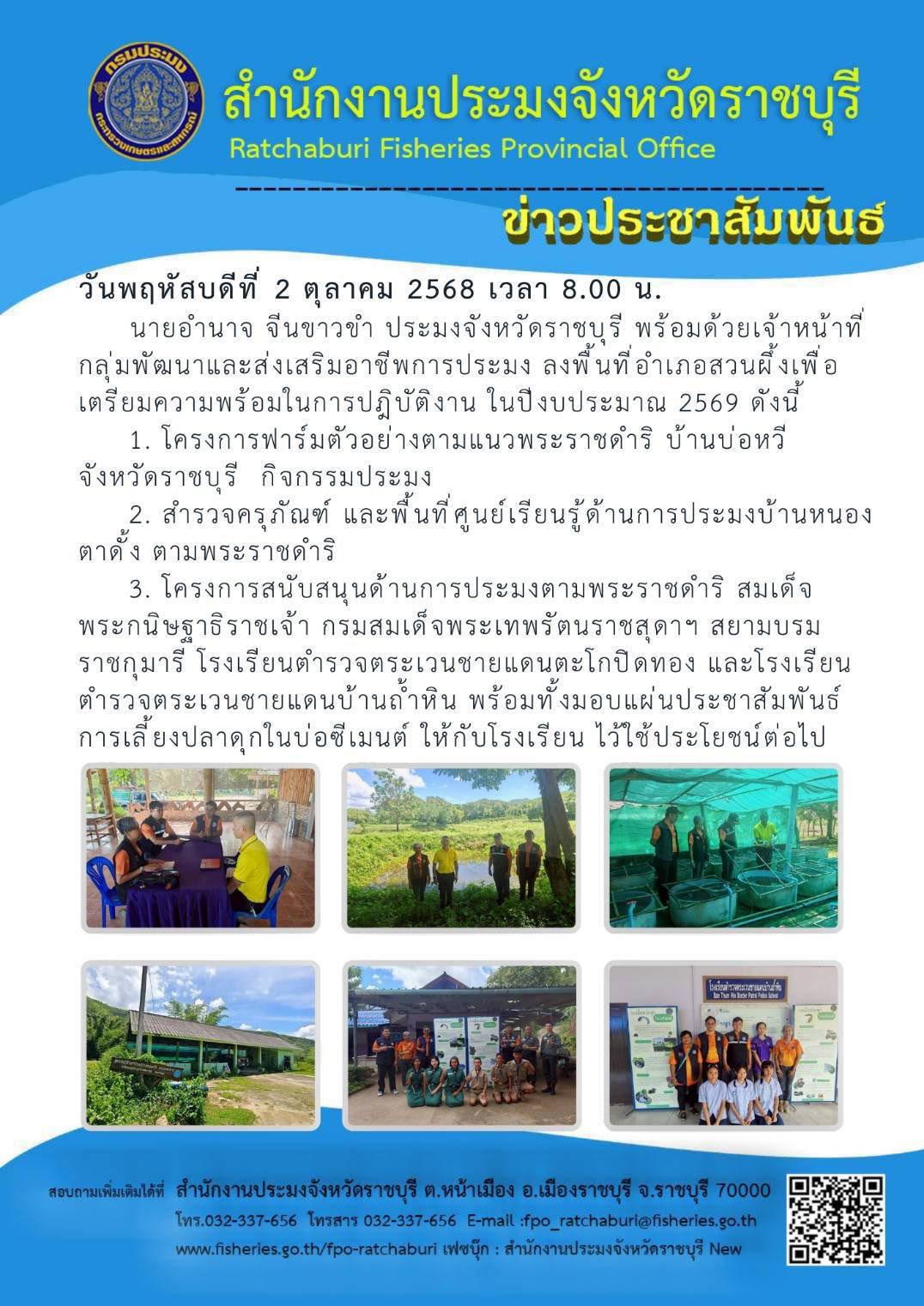 วันพฤหัสบดีที่ 2 ตุลาคม 2568 เวลา 8.00 น. นายอำนาจ จีนขาวขำ ประมงจังหวัดราชบุรี พร้อมด้วยเจ้าหน้าที่กลุ่มพัฒนาและส่งเสริมอาชีพการประมง ลงพื้นที่อำเภอสวนผึ้งเพื่อเตรียมความพร้อมในการปฏิบัติงาน ในปีงบประมาณ 2569 ดังนี้