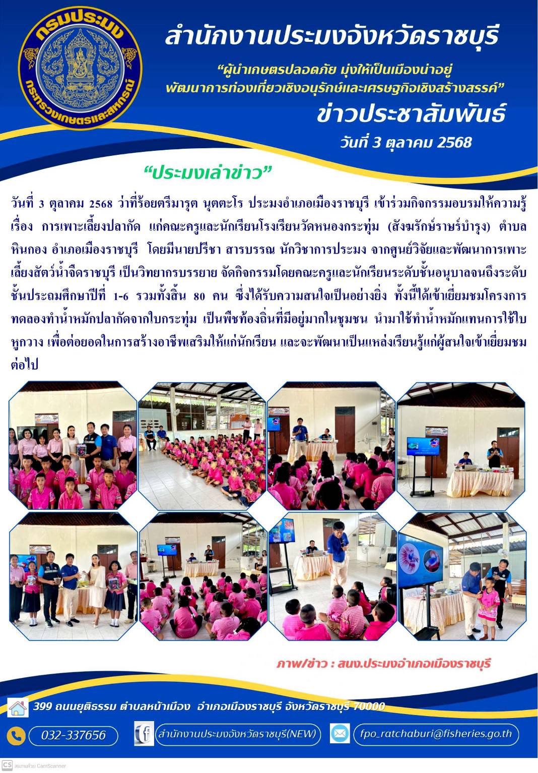 วันที่ 3 ตุลาคม 2568 ว่าที่ร้อยตรีมารุต นุตตะโร ประมงอำเภอเมืองราชบุรี เข้าร่วมกิจกรรมอบรมให้ความรู้เรื่อง การเพาะเลี้ยงปลากัด แก่คณะครูและนักเรียน โรงเรียนวัดหนองกระทุ่ม (สังฆรักษ์ราษร์บำรุง) ตำบลหินกอง อำเภอเมืองราชบุรี โดยมีนายปรีชา สารบรรณ นักวิชาการประมง จากศูนย์วิจัยและพัฒนาการ เพาะเลี้ยงสัตว์น้ำจืดราชบุรี เป็นวิทยากรบรรยาย จัดกิจกรรมโดยคณะครูและนักเรียน ระดับชั้นอนุบาลจนถึงระดับชั้นประถมศึกษาปีที่ 1-6 รวมทั้งสิ้น 80 คน ซึ่งได้รับความสนใจเป็นอย่างยิ่ง ทั้งนี้ได้เข้าเยี่ยมชมโครงการทดลองทำน้ำหมักปลากัดจากใบกระทุ่ม เป็นพืชท้องถิ่นที่มีอยู่มากในชุมชน นำมาใช้ทำน้ำหมักแทนการใช้ใบหูกวาง เพื่อต่อยอดในการสร้างอาชีพเสริมให้แก่นักเรียนและจะพัฒนาเป็นแหล่งเรียนรู้แก่ผู้สนใจ เข้าเยี่ยมชมต่อไป