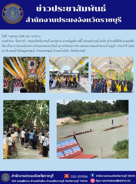 วันอังคารที่ 7 ตุลาคม 2568 เวลา 10.30 น. นายอำนาจ จีนขาวขำ ประมงจังหวัดราชบุรี มอบหมาย นางขวัญฤทัย แซ่ลี้ ประมงอำเภอบ้านโป่ง เข้าร่วมพิธีเปิดงานแข่งขันกีฬาเรือยาวประเพณีเทศกาลวันออกพรรษาชิงถ้วยรางวัลพระราชทานพระบาทสมเด็จพระเจ้าอยู่หัว ประจำปี 2568 ณ บริเวณหน้าวัดใหญ่นครชุมน์ ตำบลนครชุมน์ อำเภอบ้านโป่ง จังหวัดราชบุรีโดย นางสาวฐิติลักษณ์ คำพา ผู้ว่าราชการจังหวัดราชบุรี เป็นประธาน
