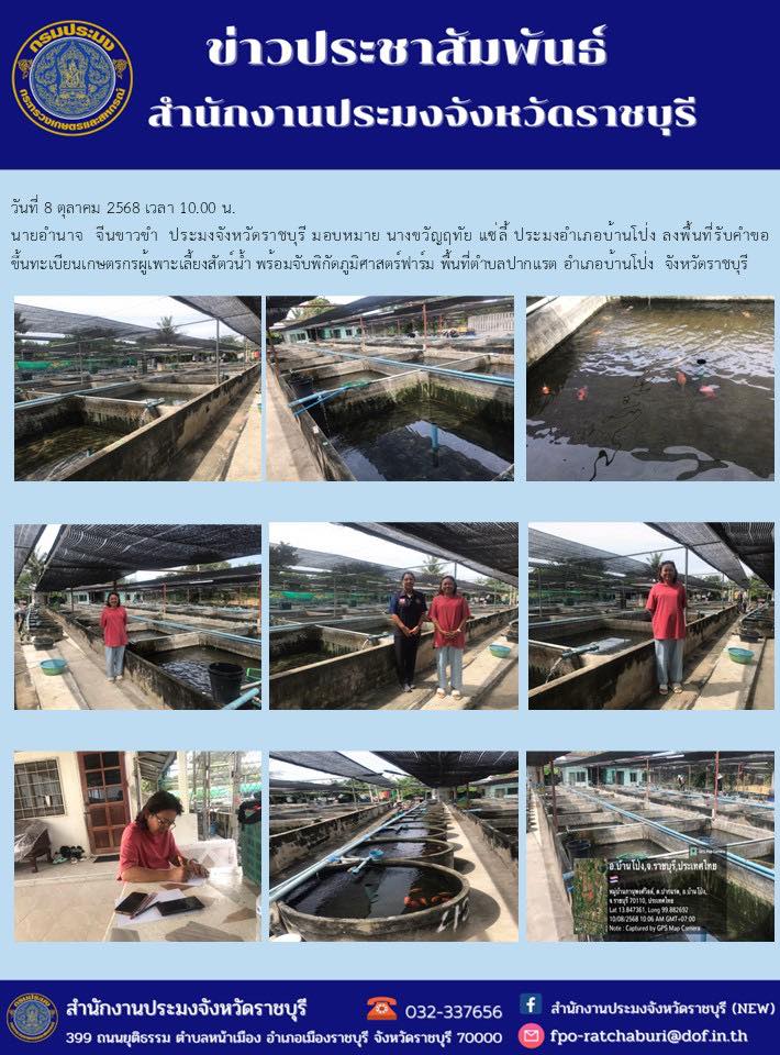 วันพุธที่ 8 ตุลาคม 2568 เวลา 10.00 น. นายอำนาจ จีนขาวขำ ประมงจังหวัดราชบุรี มอบหมาย นางขวัญฤทัย แซ่ลี้ ประมงอำเภอบ้านโป่ง ลงพื้นที่รับคำขอขึ้นทะเบียนเกษตรกรผู้เพาะเลี้ยงสัตว์น้ำ พร้อมจับพิกัดภูมิศาสตร์ฟาร์ม พื้นที่ตำบลปากแรต อำเภอบ้านโป่ง จังหวัดราชบุรี