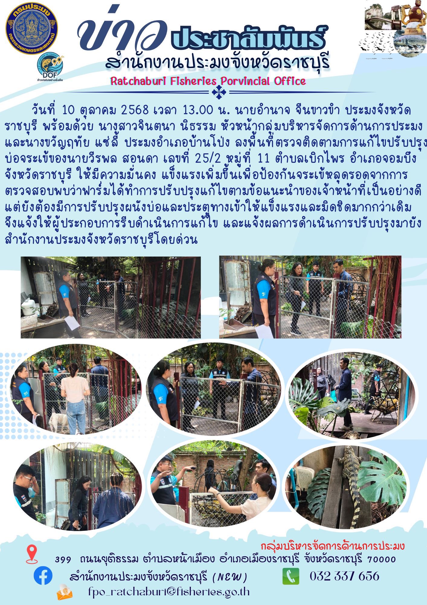 วันที่ 10 ตุลาคม 2568 เวลา 13.00 น. นายอำนาจ จีนขาวขำ ประมงจังหวัดราชบุรี พร้อมด้วย นางสาวจินตนา นิธรรม หัวหน้ากลุ่มบริหารจัดการด้านการประมง และนางขวัญฤทัย แซ่ลี้ ประมงอำเภอบ้านโป่ง ลงพื้นที่ตรวจติดตามการแก้ไขปรับปรุงบ่อจระเข้ของนายวีรพล สอนดา เลขที่ 25/2 หมู่ที่ 11 ตำบลเบิกไพร อำเภอจอมบึง จังหวัดราชบุรี ให้มีความมั่นคง แข็งแรงเพิ่มขึ้นเพื่อป้องกันจระเข้หลุดรอดจากการตรวจสอบพบว่าฟาร์มได้ทำการปรับปรุงแก้ไขตามข้อแนะนำของเจ้าหน้าที่เป็นอย่างดี แต่ยังต้องมีการปรับปรุงผนังบ่อและประตูทางเข้าให้แข็งแรงและมิดชิดมากกว่าเดิมจึงแจ้งให้ผู้ประกอบการรีบดำเนินการแก้ไข และแจ้งผลการดำเนินการปรับปรุงมายังสำนักงานประมงจังหวัดราชบุรีโดยด่วน