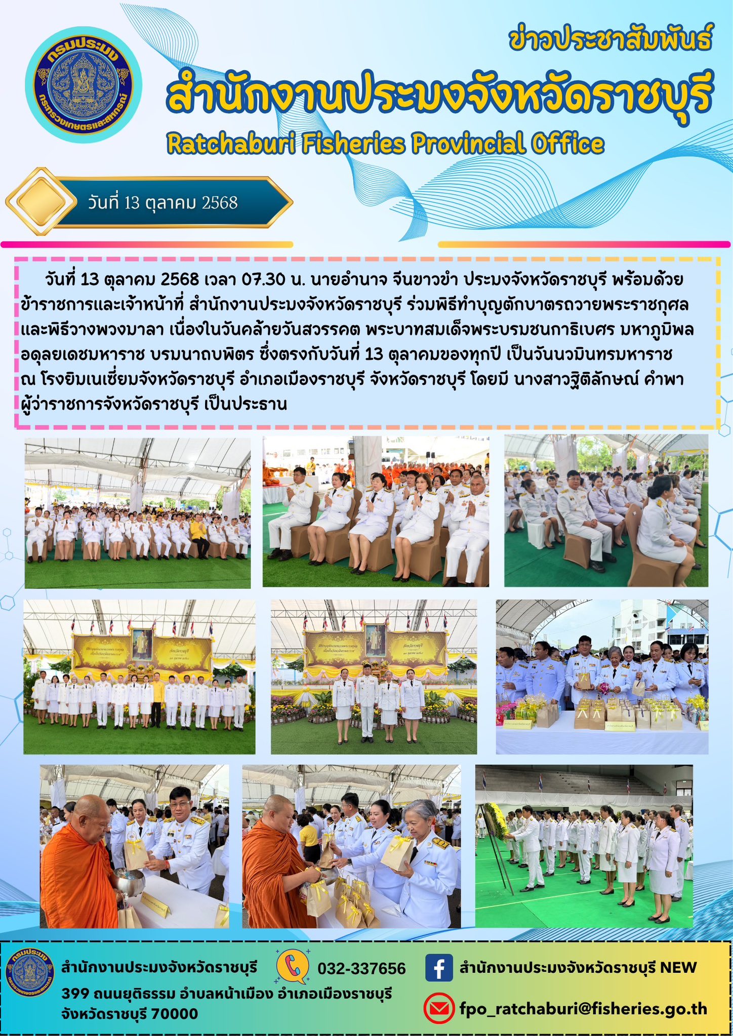 วันที่ 13 ตุลาคม 2568 เวลา 07.30 น. นายอำนาจ จีนขาวขำ ประมงจังหวัดราชบุรี พร้อมด้วย ข้าราชการและเจ้าหน้าที่ สำนักงานประมงจังหวัดราชบุรี ร่วมพิธีทำบุญตักบาตรถวายพระราชกุศลและพิธีวางพวงมาลา เนื่องในวันคล้ายวันสวรรคต พระบาทสมเด็จพระบรมชนกาธิเบศร มหาภูมิพลอดุลยเดชมหาราช บรมนาถบพิตร ซึ่งตรงกับวันที่ 13 ตุลาคมของทุกปี เป็นวันนวมินทรมหาราช ณ โรงยิมเนเซี่ยมจังหวัดราชบุรี อำเภอเมืองราชบุรี จังหวัดราชบุรี โดยมี นางสาวฐิติลักษณ์ คำพา ผู้ว่าราชการจังหวัดราชบุรี เป็นประธาน