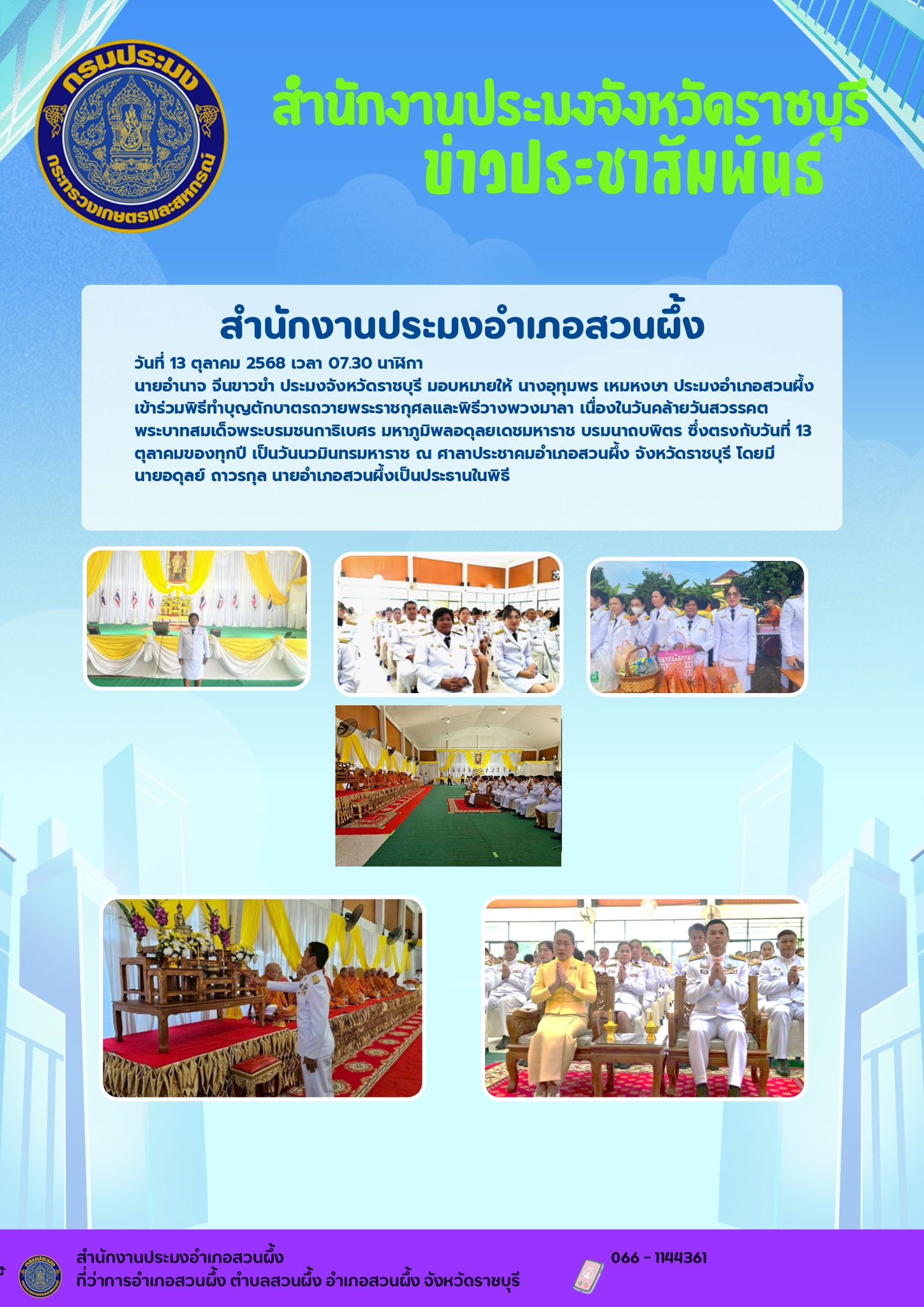 วันที่ 13 ตุลาคม 2568 เวลา 07.30 นาฬิกา นายอำนาจ จีนขาวขำ ประมงจังหวัดราชบุรี มอบหมายให้ นางอุทุมพร เหมหงษา ประมงอำเภอสวนผึ้ง เข้าร่วมพิธีทำบุญตักบาตรถวายพระราชกุศลและพิธีวางพวงมาลา เนื่องในวันคล้ายวันสวรรคต พระบาทสมเด็จพระบรมชนกาธิเบศร มหาภูมิพลอดุลยเดชมหาราช บรมนาถบพิตร ซึ่งตรงกับวันที่ 13 ตุลาคมของทุกปี เป็นวันนวมินทรมหาราช ณ ศาลาประชาคมอำเภอสวนผึ้ง จังหวัดราชบุรี โดยมี นายอดุลย์ ถาวรกุล นายอำเภอสวนผึ้งเป็นประธานในพิธี