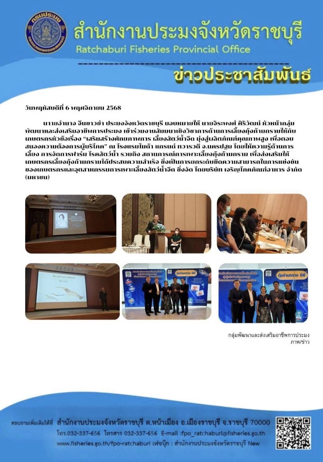 วันพฤหัสบดีที่ 6 พฤศจิกายน 2568 นายอำนาจ จีนขาวขำ ประมงจังหวัดราชบุรี มอบหมายให้ นายจิระพงศ์ ศิริวัฒน์ หัวหน้ากลุ่มพัฒนาและส่งเสริมอาชีพการประมง เข้าร่วมงานสัมมนาเชิงวิชาการด้านการเลี้ยงกุ้งก้ามกรามให้กับเกษตรกรหัวข้อเรื่อง “เสริมสร้างศักยภาพการ เลี้ยงสัตว์น้ำจืด มุ่งสู่ผลิตภัณฑ์คุณภาพสูง เพื่อตอบสนองความต้องการผู้บริโภค” ณ โรงแรมไมด้า แกรนด์ ทวารวดี จ.นครปฐม โดยให้ความรู้ด้านการเลี้ยง การจัดการฟาร์ม โรคสัตว์น้ำ รวมถึง สถานการณ์การเพาะเลี้ยงกุ้งก้ามกราม เพื่อส่งเสริมให้เกษตรกรเลี้ยงกุ้งก้ามกรามได้ประสบความสำเร็จ ซึ่งเป็นการยกระดับขีดความสามารถในการแข่งขันของเกษตรกรและอุตสาหกรรมการเพาะเลี้ยงสัตว์น้ำจืด ซึ่งจัด โดยบริษัท เจริญโภคภัณฑ์อาหาร จำกัด (มหาชน)