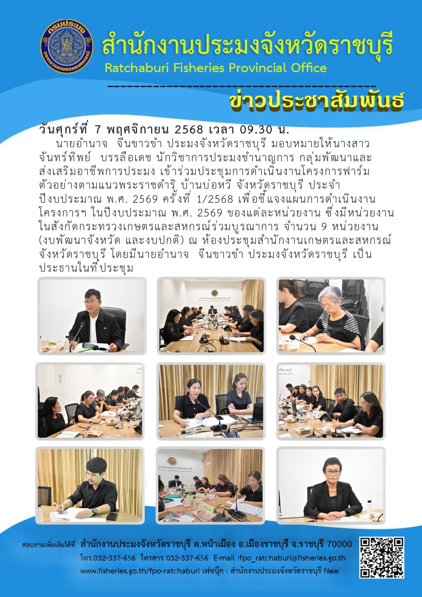 วันที่ 7 พฤศจิกายน 2568 นายอำนาจ จีนขาวขำ ประมงจังหวัดราชบุรี มอบหมายให้นางสาวจันทร์ทิพย์ บรรลือเดช นักวิชาการประมงชำนาญการ กลุ่มพัฒนาและส่งเสริมอาชีพการประมง เข้าร่วมประชุมการดำเนินงานโครงการฟาร์มตัวอย่างตามแนวพระราชดำริ บ้านบ่อหวี จังหวัดราชบุรี ประจำปีงบประมาณ พ.ศ. 2569 ครั้งที่ 1/2568 เพื่อชี้แจงแผนการดำเนินงานโครงการฯ ในปีงบประมาณ พ.ศ. 2569 ของแต่ละหน่วยงาน ซึ่งมีหน่วยงานในสังกัดกระทรวงเกษตรและสหกรณ์ร่วมบูรณาการ จำนวน 9 หน่วยงาน (งบพัฒนาจังหวัด และงบปกติ) ณ ห้องประชุมสำนักงานเกษตรและสหกรณ์จังหวัดราชบุรี โดยมีนายอำนาจ จีนขาวขำ ประมงจังหวัดราชบุรี เป็นประธานในที่ประชุม