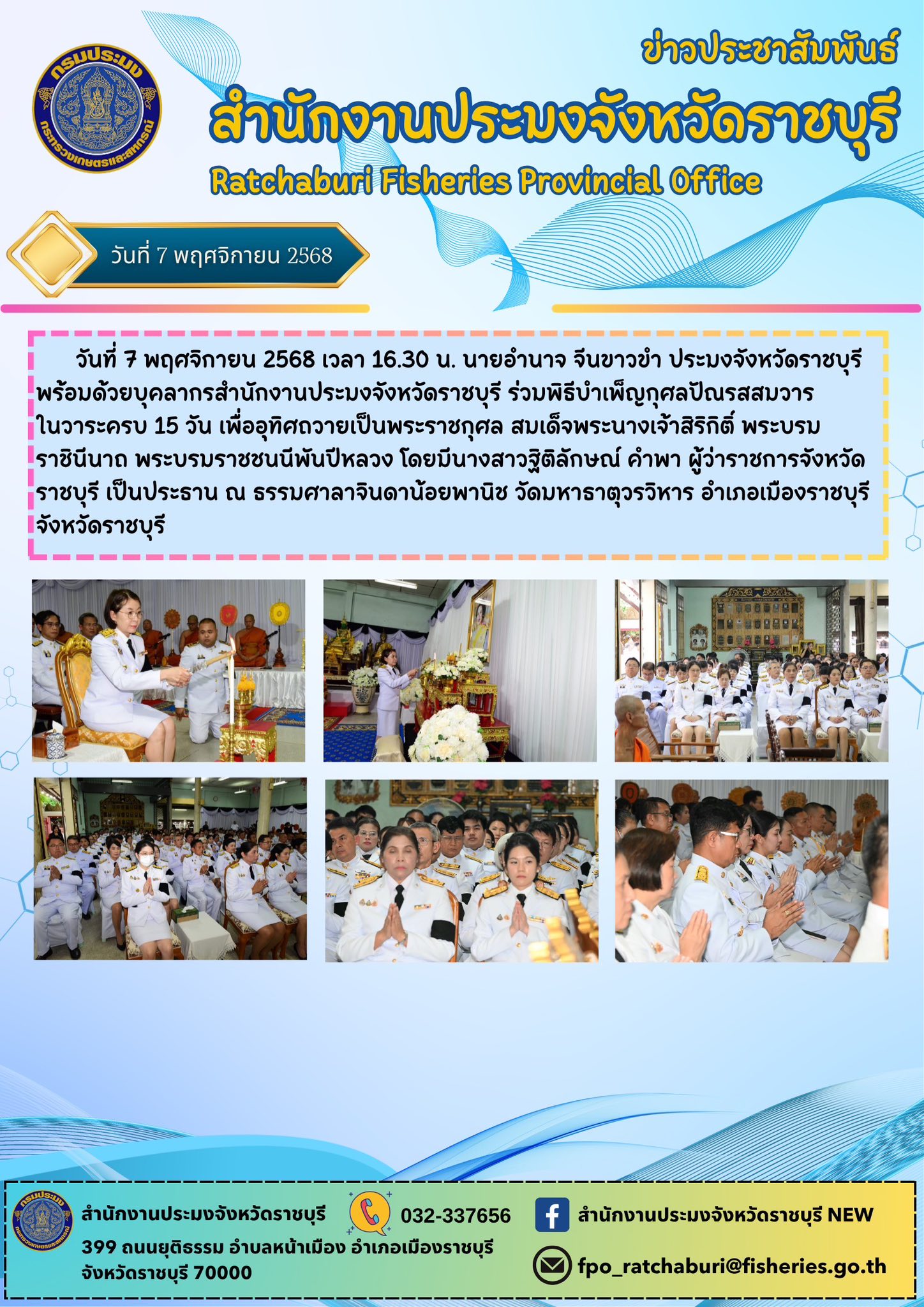 วันที่ 7 พฤศจิกายน 2568 เวลา 16.30 น. นายอำนาจ จีนขาวขำ ประมงจังหวัดราชบุรี พร้อมด้วยบุคลากรสำนักงานประมงจังหวัดราชบุรี ร่วมพิธีบำเพ็ญกุศลปัณรสสมวาร ในวาระครบ 15 วัน เพื่ออุทิศถวายเป็นพระราชกุศล สมเด็จพระนางเจ้าสิริกิติ์ พระบรมราชินีนาถ พระบรมราชชนนีพันปีหลวง โดยมีนางสาวฐิติลักษณ์ คำพา ผู้ว่าราชการจังหวัดราชบุรี เป็นประธาน ณ ธรรมศาลาจินดาน้อยพานิช วัดมหาธาตุวรวิหาร อำเภอเมืองราชบุรี จังหวัดราชบุรี