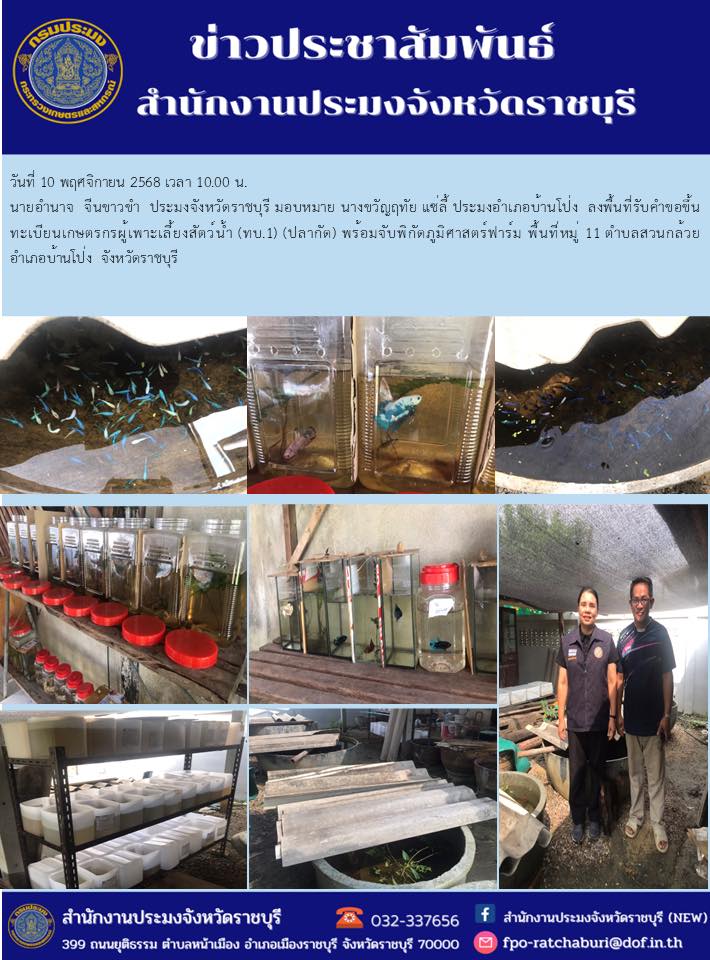 วันที่ 10 พฤศจิกายน 2568 เวลา 10.00 น. นายอำนาจ จีนขาวขำ ประมงจังหวัดราชบุรี มอบหมาย นางขวัญฤทัย แซ่ลี้ ประมงอำเภอบ้านโป่ง ลงพื้นที่รับคำขอขึ้นทะเบียนเกษตรกรผู้เพาะเลี้ยงสัตว์น้ำ (ทบ.1) (ปลากัด) พร้อมจับพิกัดภูมิศาสตร์ฟาร์ม พื้นที่หมู่ 11 ตำบลสวนกล้วย อำเภอบ้านโป่ง จังหวัดราชบุรี