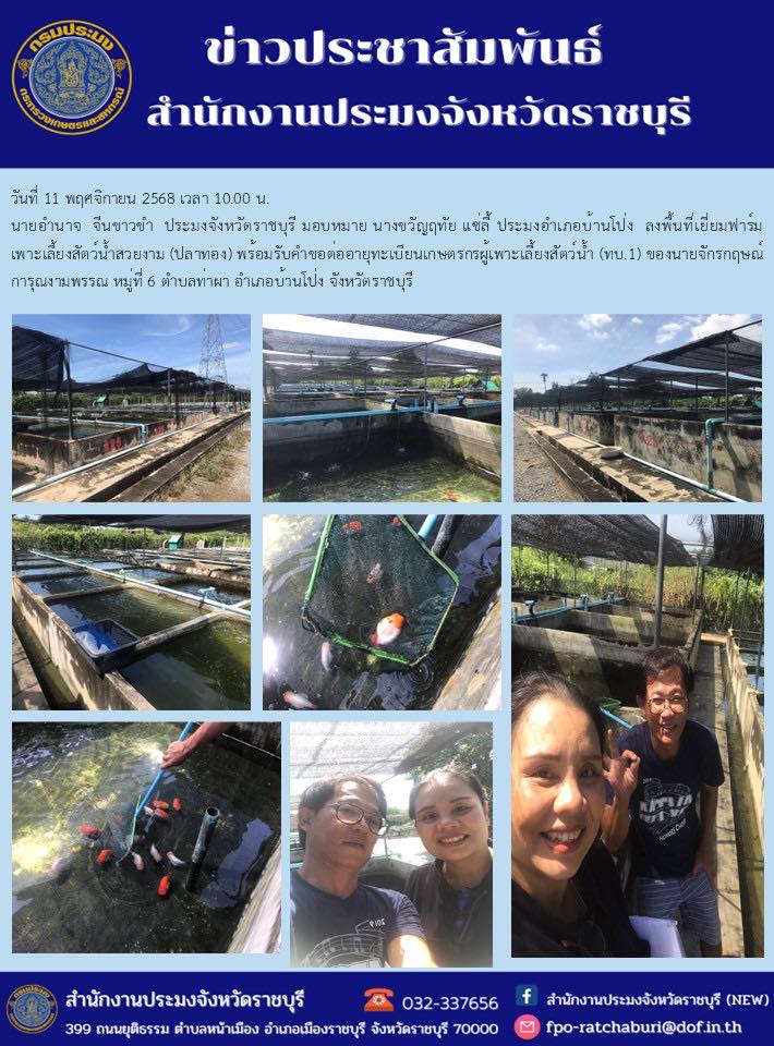 วันที่ 11 พฤศจิกายน 2568 เวลา 10.00 น. นายอำนาจ จีนขาวขำ ประมงจังหวัดราชบุรี มอบหมาย นางขวัญฤทัย แซ่ลี้ ประมงอำเภอบ้านโป่ง ลงพื้นที่เยี่ยมฟาร์มเพาะเลี้ยงสัตว์น้ำสวยงาม (ปลาทอง) พร้อมรับคำขอต่ออายุทะเบียนเกษตรกรผู้เพาะเลี้ยงสัตว์น้ำ (ทบ.1) ของนายจักรกฤษณ์ การุณงามพรรณ หมู่ที่ 6 ตำบลท่าผา อำเภอบ้านโป่ง จังหวัดราชบุรี