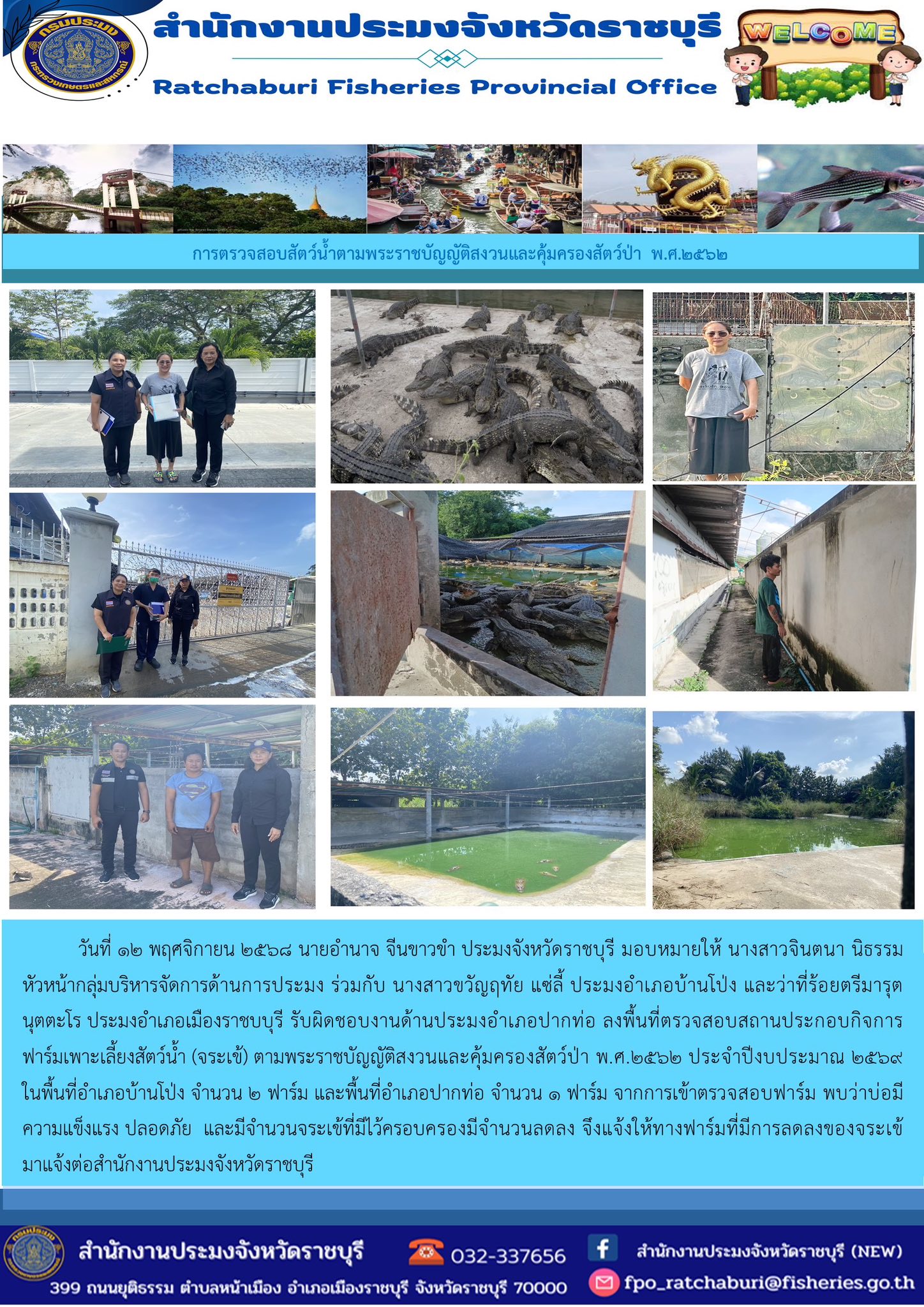 วันที่ 12 พฤศจิกายน 2568 นายอำนาจ จีนขาวขำ ประมงจังหวัดราชบุรี มอบหมายให้ นางสาวจินตนา นิธรรม หัวหน้ากลุ่มบริหารจัดการด้านการประมง ร่วมกับ นางสาวขวัญฤทัย แซ่ลี้ ประมงอำเภอบ้านโป่ง และว่าที่ร้อยตรีมารุต นุตตะโร ประมงอำเภอเมืองราชบบุรี รับผิดชอบงานด้านประมงอำเภอปากท่อ ลงพื้นที่ตรวจสอบสถานประกอบกิจการฟาร์มเพาะเลี้ยงสัตว์น้ำ (จระเข้) ตามพระราชบัญญัติสงวนและคุ้มครองสัตว์ป่า พ.ศ.2562 ประจำปีงบประมาณ 2569 ในพื้นที่อำเภอบ้านโป่ง จำนวน 2 ฟาร์ม และพื้นที่อำเภอปากท่อ จำนวน 1 ฟาร์ม จากการเข้าตรวจสอบฟาร์ม พบว่าบ่อมีความแข็งแรง ปลอดภัย และมีจำนวนจระเข้ที่มีไว้ครอบครองมีจำนวนลดลง จึงแจ้งให้ทางฟาร์มที่มีการลดลงของจระเข้ มาแจ้งต่อสำนักงานประมงจังหวัดราชบุรี