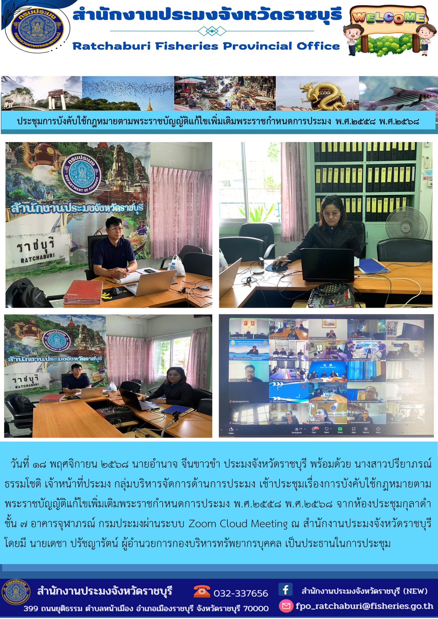วันที่ 18 พฤศจิกายน 2568 นายอำนาจ จีนขาวขำ ประมงจังหวัดราชบุรี พร้อมด้วย นางสาวปรียาภรณ์ ธรรมโชติ เจ้าหน้าที่ประมง กลุ่มบริหารจัดการด้านการประมง ร่วมประชุมเรื่องการบังคับใช้กฎหมายตามพระราชบัญญัติแก้ไขเพิ่มเติมพระราชกำหนดการประมง พ.ศ.2558 พ.ศ.2568 จากห้องประชุมกุลาดำ ชั้น 7 อาคารจุฬาภรณ์ กรมประมง ผ่านระบบ Zoom Cloud Meeting ณ สำนักงานประมงจังหวัดราชบุรี โดยมี นายเดชา ปรัชญารัตน์ ผู้อำนวยการกองบริหารทรัพยากรบุคคล เป็นประธานในการประชุม