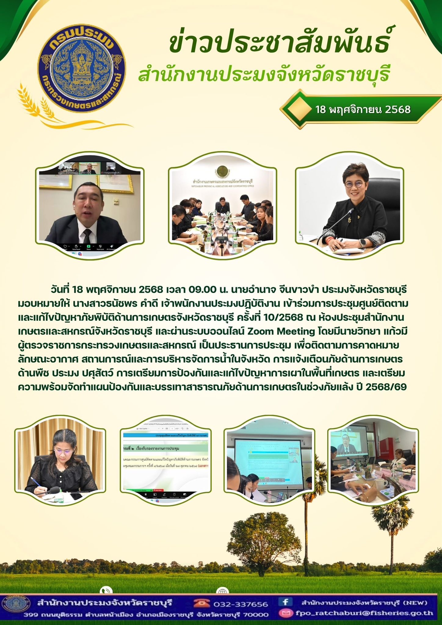 วันที่ 18 พฤศจิกายน 2568 เวลา 09.00 น. นายอำนาจ จีนขาวขำ ประมงจังหวัดราชบุรี มอบหมายให้ นางสาวธนัชพร คำดี เจ้าพนักงานประมงปฏิบัติงาน เข้าร่วมการประชุมศูนย์ติดตามและแก้ไขปัญหาภัยพิบัติด้านการเกษตรจังหวัดราชบุรี ครั้งที่ 10/2568 ณ ห้องประชุมสำนักงานเกษตรและสหกรณ์จังหวัดราชบุรี และผ่านระบบออนไลน์ Zoom Meeting โดยมีนายวิทยา แก้วมี ผู้ตรวจราชการกระทรวงเกษตรและสหกรณ์ เป็นประธานการประชุม เพื่อติดตามการคาดหมายลักษณะอากาศ สถานการณ์และการบริหารจัดการน้ำในจังหวัด การแจ้งเตือนภัยด้านการเกษตร ด้านพืช ประมง ปศุสัตว์ การเตรียมการป้องกันและแก้ไขปัญหาการเผาในพื้นที่เกษตร และเตรียมความพร้อมจัดทำแผนป้องกันและบรรเทาสาธารณภัยด้านการเกษตรในช่วงภัยแล้ง ปี 2568/69