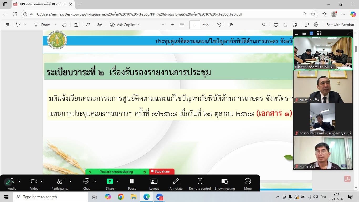 เข้าร่วมการประชุมศูนย์ติดตามและแก้ไขปัญหาภัยพิบัติด้านการเกษตรจังหวัดราชบุรี ครั้งที่ 10/2568