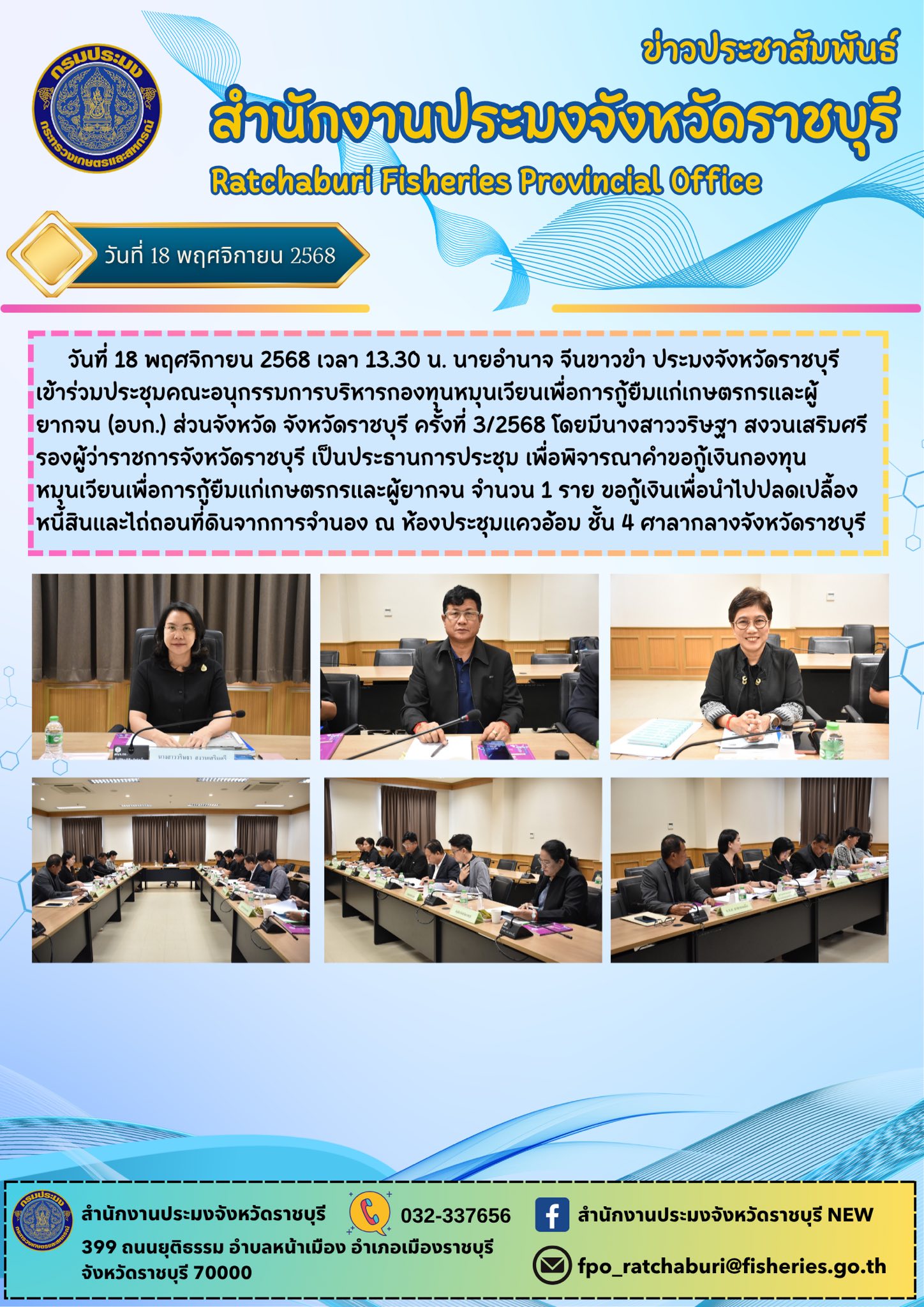 วันที่ 18 พฤศจิกายน 2568 เวลา 13.30 น. นายอำนาจ จีนขาวขำ ประมงจังหวัดราชบุรี เข้าร่วมประชุมคณะอนุกรรมการบริหารกองทุนหมุนเวียนเพื่อการกู้ยืมแก่เกษตรกรและผู้ยากจน (อบก.) ส่วนจังหวัด จังหวัดราชบุรี ครั้งที่ 3/2568 โดยมีนางสาววริษฐา สงวนเสริมศรี รองผู้ว่าราชการจังหวัดราชบุรี เป็นประธานการประชุม เพื่อพิจารณาคำขอกู้เงินกองทุนหมุนเวียนเพื่อการกู้ยืมแก่เกษตรกรและผู้ยากจน จำนวน 1 ราย ขอกู้เงินเพื่อนำไปปลดเปลื้องหนี้สินและไถ่ถอนที่ดินจากการจำนอง ณ ห้องประชุมแควอ้อม ชั้น 4 ศาลากลางจังหวัดราชบุรี