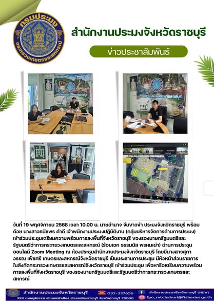 วันที่ 19 พฤศจิกายน 2568 เวลา 10.00 น. นายอำนาจ จีนขาวขำ ประมงจังหวัดราชบุรี พร้อมด้วย นางสาวธนัชพร คำดี เจ้าพนักงานประมงปฏิบัติงาน (กลุ่มบริหารจัดการด้านการประมง) เข้าร่วมประชุมเตรียมความพร้อมการลงพื้นที่จังหวัดราชบุรี ของรองนายกรัฐมนตรีและรัฐมนตรีว่าการกระทรวงเกษตรและสหกรณ์ (ร้อยเอก ธรรมนัส พรหมเผ่า) ผ่านการประชุมออนไลน์ Zoom Meeting ณ ห้องประชุมสำนักงานประมงจังหวัดราชบุรี โดยมีนางสาวสุภาวรรณ เพ็ชศรี เกษตรและสหกรณ์จังหวัดราชบุรี เป็นประธานการประชุม มีหัวหน้าส่วนราชการในสังกัดกระทรวงเกษตรและสหกรณ์จังหวัดราชบุรี เข้าร่วมประชุม เพื่อหารือเตรียมความพร้อมการลงพื้นที่จังหวัดราชบุรี ของรองนายกรัฐมนตรีและรัฐมนตรีว่าการกระทรวงเกษตรและสหกรณ์