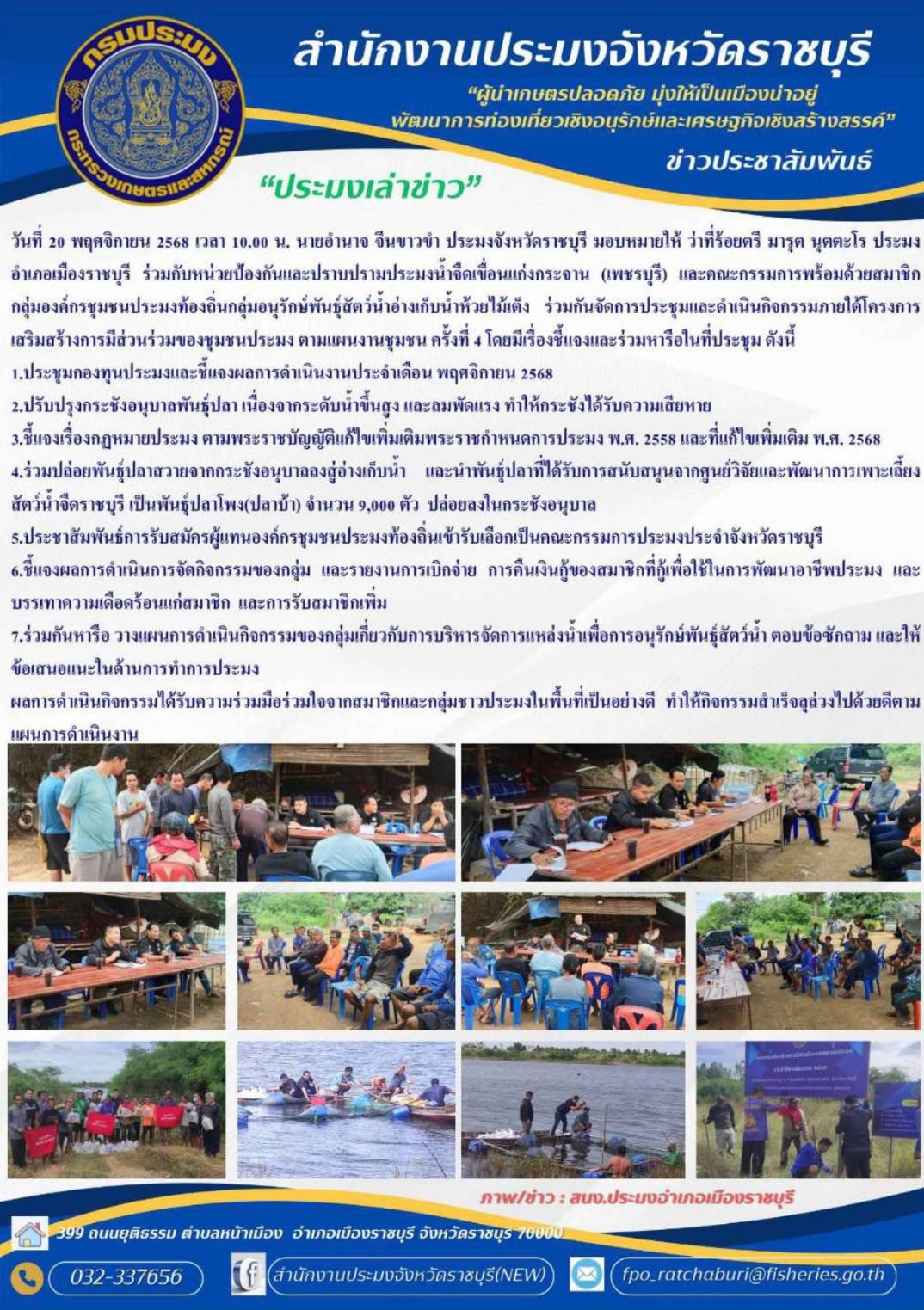 วันที่ 20 พฤศจิกายน 2568 เวลา 10.00 น. นายอำนาจ จีนขาวขำ ประมงจังหวัดราชบุรี มอบหมายให้ ว่าที่ร้อยตรี มารุต นุตตะโร ประมงอำเภอเมืองราชบุรี ร่วมกับหน่วยป้องกันและปราบปรามประมงน้ำจืด เขื่อนแก่งกระจาน (เพชรบุรี) และคณะกรรมการพร้อมด้วยสมาชิก กลุ่มองค์กรชุมชนประมงท้องถิ่นกลุ่มอนุรักษ์พันธุ์สัตว์น้ำอ่างเก็บน้ำ ห้วยไม้เต็ง ร่วมกันจัดการประชุมและดำเนินกิจกรรมภายใต้โครงการ เสริมสร้างการมีส่วนร่วมของชุมชนประมง ตามแผนงานชุมชน ครั้งที่ 4 โดยมีเรื่องชี้แจงและร่วมหารือในที่ประชุม ดังนี้