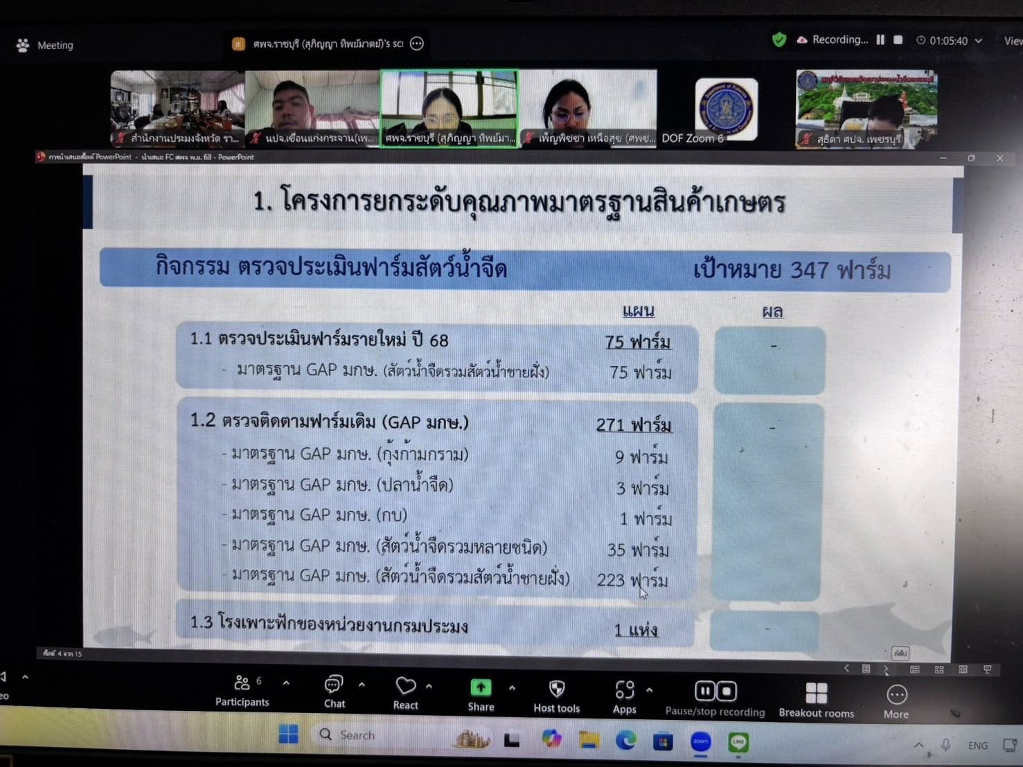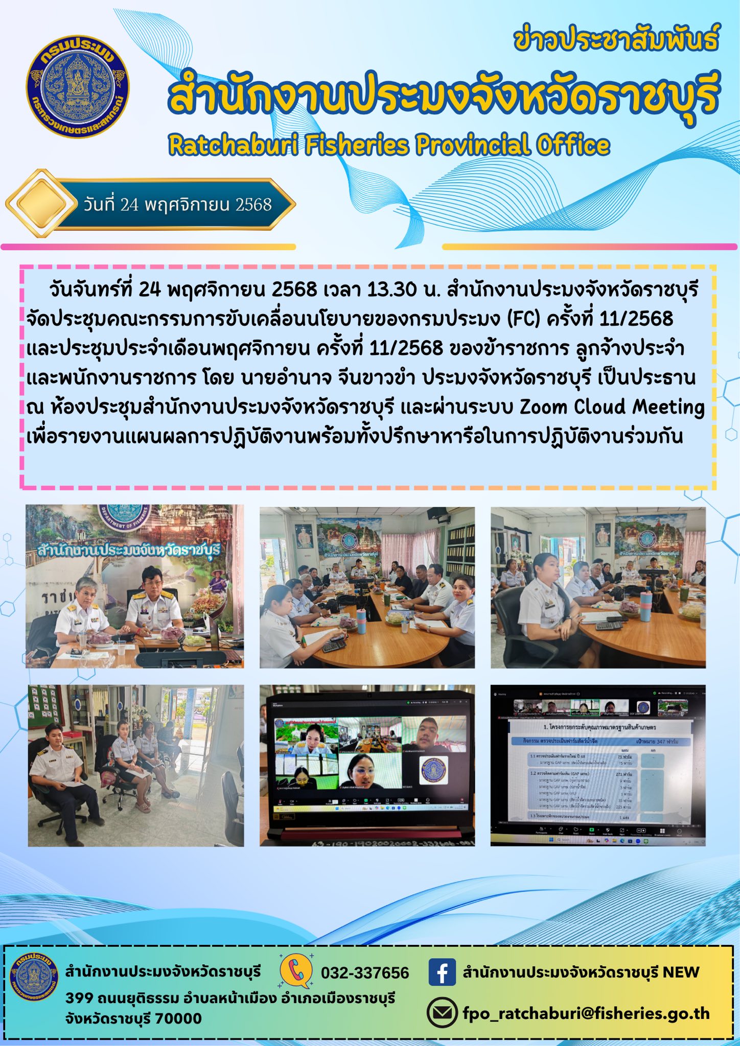 วันจันทร์ที่ 24 พฤศจิกายน 2568 เวลา 13.30 น. สำนักงานประมงจังหวัดราชบุรี จัดประชุมคณะกรรมการขับเคลื่อนนโยบายของกรมประมง (FC) ครั้งที่ 11/2568 และประชุมประจำเดือนพฤศจิกายน ครั้งที่ 11/2568 ของข้าราชการ ลูกจ้างประจำ และพนักงานราชการ โดย นายอำนาจ จีนขาวขำ ประมงจังหวัดราชบุรี เป็นประธาน ณ ห้องประชุมสำนักงานประมงจังหวัดราชบุรี และผ่านระบบ Zoom Cloud Meeting เพื่อรายงานแผนผลการปฏิบัติงานพร้อมทั้งปรึกษาหารือในการปฏิบัติงานร่วมกัน