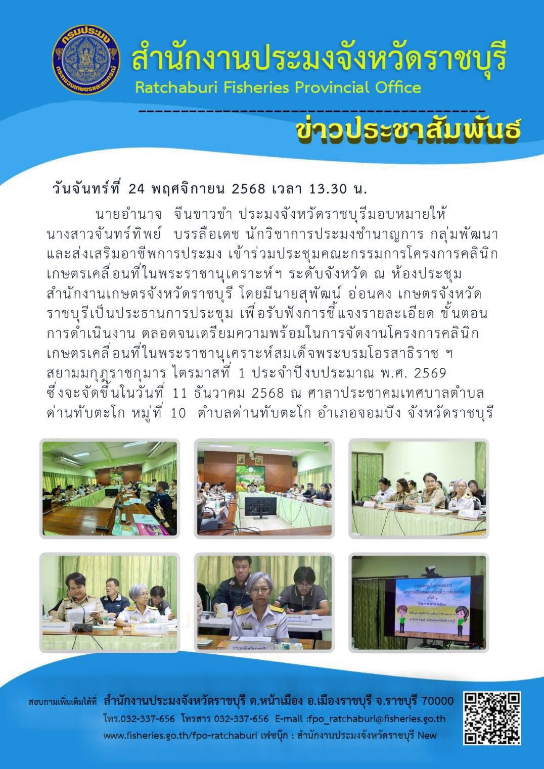 วันที่ 24 พฤศจิกายน 2568 เวลา 13.30 น. นายอำนาจ จีนขาวขำ ประมงจังหวัดราชบุรีมอบหมายให้ นางสาวจันทร์ทิพย์ บรรลือเดช นักวิชาการประมงชำนาญการ กลุ่มพัฒนาและส่งเสริมอาชีพการประมง เข้าร่วมประชุมคณะกรรมการโครงการคลินิกเกษตรเคลื่อนที่ในพระราชานุเคราะห์ฯ ระดับจังหวัด ณ ห้องประชุมสำนักงานเกษตรจังหวัดราชบุรี โดยมีนายสุพัฒน์ อ่อนคง เกษตรจังหวัดราชบุรีเป็นประธานการประชุม เพื่อรับฟังการชี้แจงรายละเอียด ขั้นตอนการดำเนินงาน ตลอดจนเตรียมความพร้อมในการจัดงานโครงการคลินิกเกษตรเคลื่อนที่ในพระราชานุเคราะห์สมเด็จพระบรมโอรสาธิราช ฯ สยามมกุฎราชกุมาร ไตรมาสที่ 1 ประจำปีงบประมาณ พ.ศ. 2569 ซึ่งจะจัดขึ้นในวันที่ 11 ธันวาคม 2568 ณ ศาลาประชาคมเทศบาลตำบลด่านทับตะโก หมู่ที่ 10 ตำบลด่านทับตะโก อำเภอจอมบึง