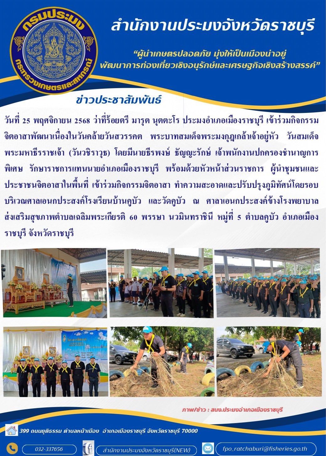 วันที่ 25 พฤศจิกายน 2568 ว่าที่ร้อยตรี มารุต นุตตะโร ประมงอำเภอเมืองราชบุรี ร่วมกิจกรรมจิตอาสาพัฒนาเนื่องในวันคล้ายวันสวรรคต พระบาทสมเด็จพระมงกุฎเกล้าเจ้าอยู่หัว วันสมเด็จพระมหาธีรราชเจ้า (วันวชิราวุธ) โดยมีนายธีรพงษ์ ธัญญะรักษ์ เจ้าพนักงานปกครองชำนาญการพิเศษ รักษาราชการแทนนายอำเภอเมืองราชบุรี พร้อมด้วยหัวหน้าส่วนราชการ ผู้นำชุมชนและประชาชนจิตอาสาในพื้นที่ เข้าร่วมกิจกรรมจิตอาสา ทำความสะอาดและปรับปรุงภูมิทัศน์โดยรอบบริเวณศาลเอนกประสงค์ โรงเรียนบ้านคูบัว และวัดคูบัว ณ ศาลาเอนกประสงค์ ข้างโรงพยาบาลส่งเสริมสุขภาพตำบลเฉลิมพระเกียรติ 60 พรรษา นวมินทราชินี หมู่ที่ 5 ตำบลคูบัว อำเภอเมืองราชบุรี จังหวัดราชบุรี