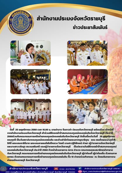 วันที่ 25 พฤศจิกายน 2568 เวลา 07.30 น. นายอำนาจ จีนขาวขำ ประมงจังหวัดราชบุรี พร้อมด้วย เจ้าหน้าที่จากสำนักงานประมงจังหวัดราชบุรี เข้าร่วมพิธีทอดผ้าป่าสมทบกองทุนแม่ของแผ่นดินจังหวัดราชบุรี ประจำปี 2568 ร่วมกับคณะกรรมการเครือข่ายกองทุนแม่ของแผ่นดินจังหวัดราชบุรี จัดขึ้นเนื่องในวันที่ 25 พฤศจิกายนของทุกปี เป็นวันสถาปนากองทุนแม่ของแผ่นดิน และต่างสำนึกในพระมหากรุณาธิคุณของ สมเด็จพระนางเจ้าสิริกิติ์ พระบรมราชินีนาถ พระบรมราชชนนีพันปีหลวง โดยมี นางสาวฐิติลักษณ์ คำพา ผู้ว่าราชการจังหวัดราชบุรี และนางสาววริษฐา สงวนเสริมศรี รองผู้ว่าราชการจังหวัดราชบุรี เป็นประธานในพิธีทอดผ้าป่าสมทบกองทุนแม่ของแผ่นดินจังหวัดราชบุรี ประจำปี 2568 หัวหน้าส่วนราชการ ทหาร ตำรวจ คณะกรรมและสมาชิกเหล่ากาชาดจังหวัดราชบุรี คณะกรรมการเครือข่ายกองทุนเเม่ของเเผ่นดินจังหวัดราชบุรี ผู้นำท้องที่ ผู้นำท้องถิ่น ตัวแทนภาคเอกชน ตัวแทนคณะกรรมการเครือข่ายกองทุนแม่ของแผ่นดิน ทั้ง 10 อำเภอร่วมกิจกรรม ณ วัดอมรินทรคาราม อำเภอเมืองราชบุรี จังหวัดราชบุรี