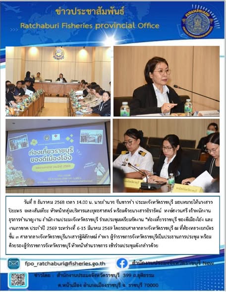 วันที่ 8 ธันวาคม 2568 เวลา 14.00 น. นายอำนาจ จีนขาวขำ ประมงจังหวัดราชบุรี มอบหมายให้ นางสาวปิยะพร เพลงสันเทียะ หัวหน้ากลุ่มบริหารและยุทธศาสตร์ พร้อมด้วย นางสาวธิรารัตน์ หงษ์สงวนศรี เจ้าพนักงานธุรการชำนาญงาน สำนักงานประมงจังหวัดราชบุรี ร่วมประชุมเตรียมจัดงาน "ท่องเที่ยวราชบุรี ของดีเมืองโอ่ง และงานกาชาด ประจำปี 2569 ระหว่างที่ 6-15 มีนาคม 2569 โดยรอบศาลากลางจังหวัดราชบุรี ณ ที่ห้องหลวงยกบัตร ชั้น ๓ ศาลากลางจังหวัดราชบุรี โดยมีนางสาวฐิติลักษณ์ คำพา ผู้ว่าราชการจังหวัดราชบุรีเป็นประธานการประชุม พร้อมด้วยรองผู้ว่าราชการจังหวัดราชบุรี หัวหน้าส่วนราชการ เข้าร่วมประชุมดังกล่าวด้วย