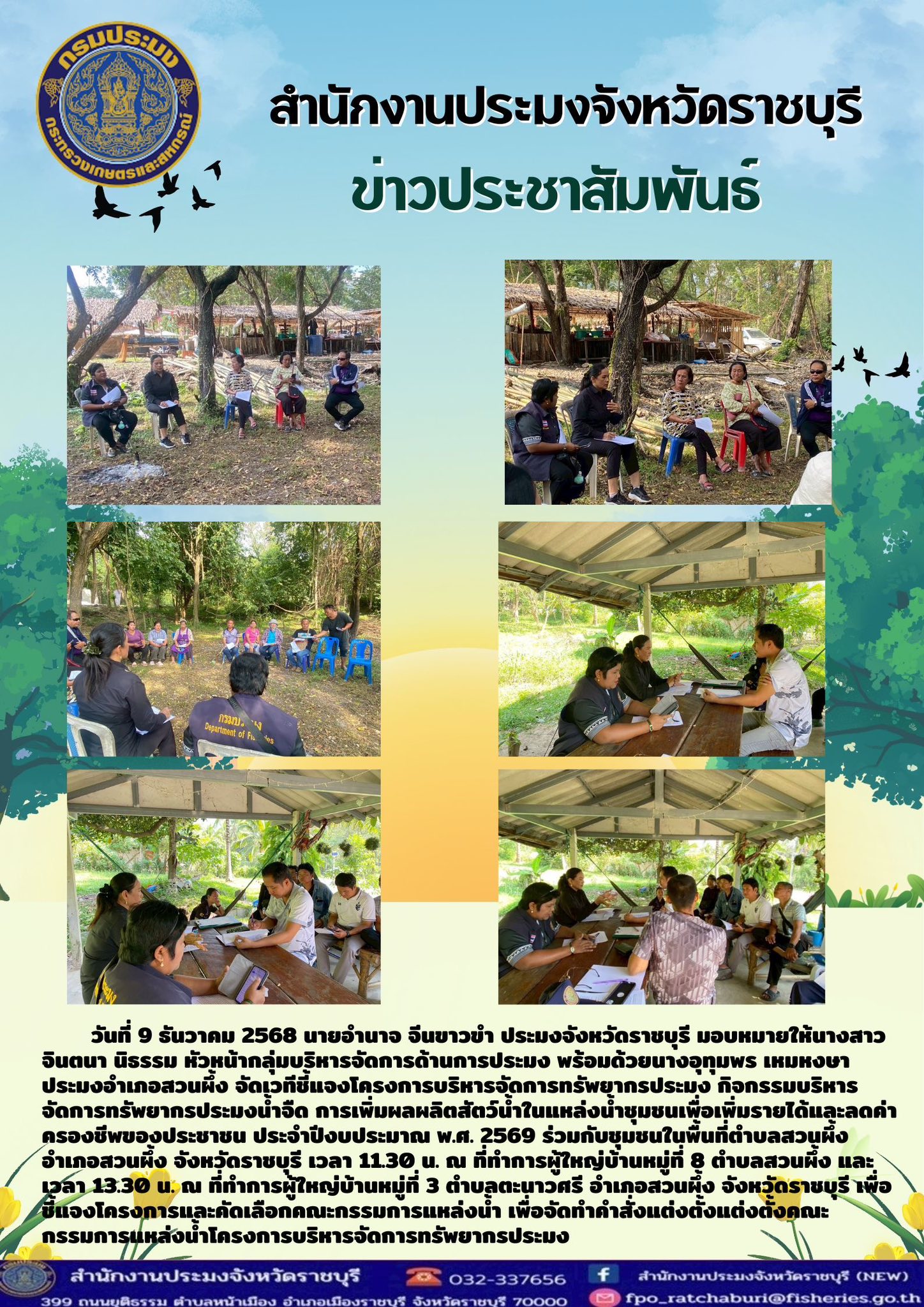 วันที่ 9 ธันวาคม 2568 นายอำนาจ จีนขาวขำ ประมงจังหวัดราชบุรี มอบหมายให้นางสาวจินตนา นิธรรม หัวหน้ากลุ่มบริหารจัดการด้านการประมง พร้อมด้วยนางอุทุมพร เหมหงษา ประมงอำเภอสวนผึ้ง จัดเวทีชี้แจงโครงการบริหารจัดการทรัพยากรประมง กิจกรรมบริหารจัดการทรัพยากรประมงน้ำจืด การเพิ่มผลผลิตสัตว์น้ำในแหล่งน้ำชุมชนเพื่อเพิ่มรายได้และลดค่าครองชีพของประชาชน ประจำปีงบประมาณ พ.ศ. 2569 ร่วมกับชุมชนในพื้นที่ตำบลสวนผึ้ง อำเภอสวนผึ้ง จังหวัดราชบุรี เวลา 11.30 น. ณ ที่ทำการผู้ใหญ่บ้านหมู่ที่ 8 ตำบลสวนผึ้ง และเวลา 13.30 น. ณ ที่ทำการผู้ใหญ่บ้านหมู่ที่ 3 ตำบลตะนาวศรี อำเภอสวนผึ้ง จังหวัดราชบุรี เพื่อชี้แจงโครงการและคัดเลือกคณะกรรมการแหล่งน้ำ เพื่อจัดทำคำสั่งแต่งตั้งแต่งตั้งคณะกรรมการแหล่งน้ำโครงการบริหารจัดการทรัพยากรประมง