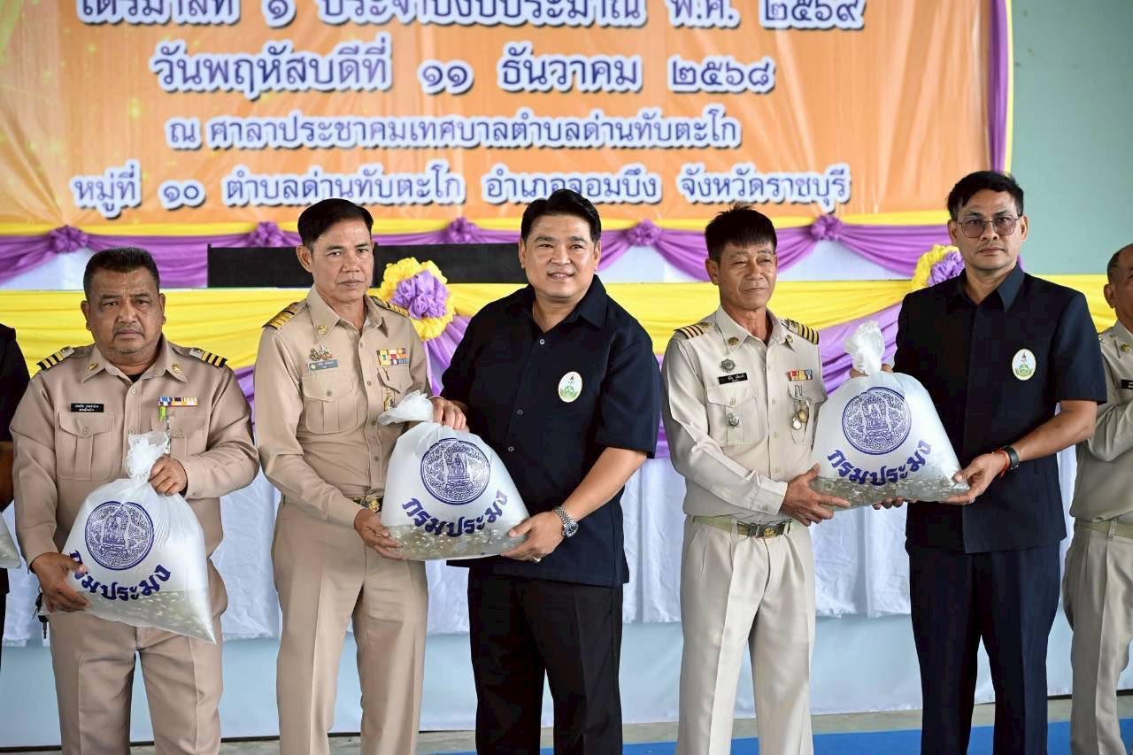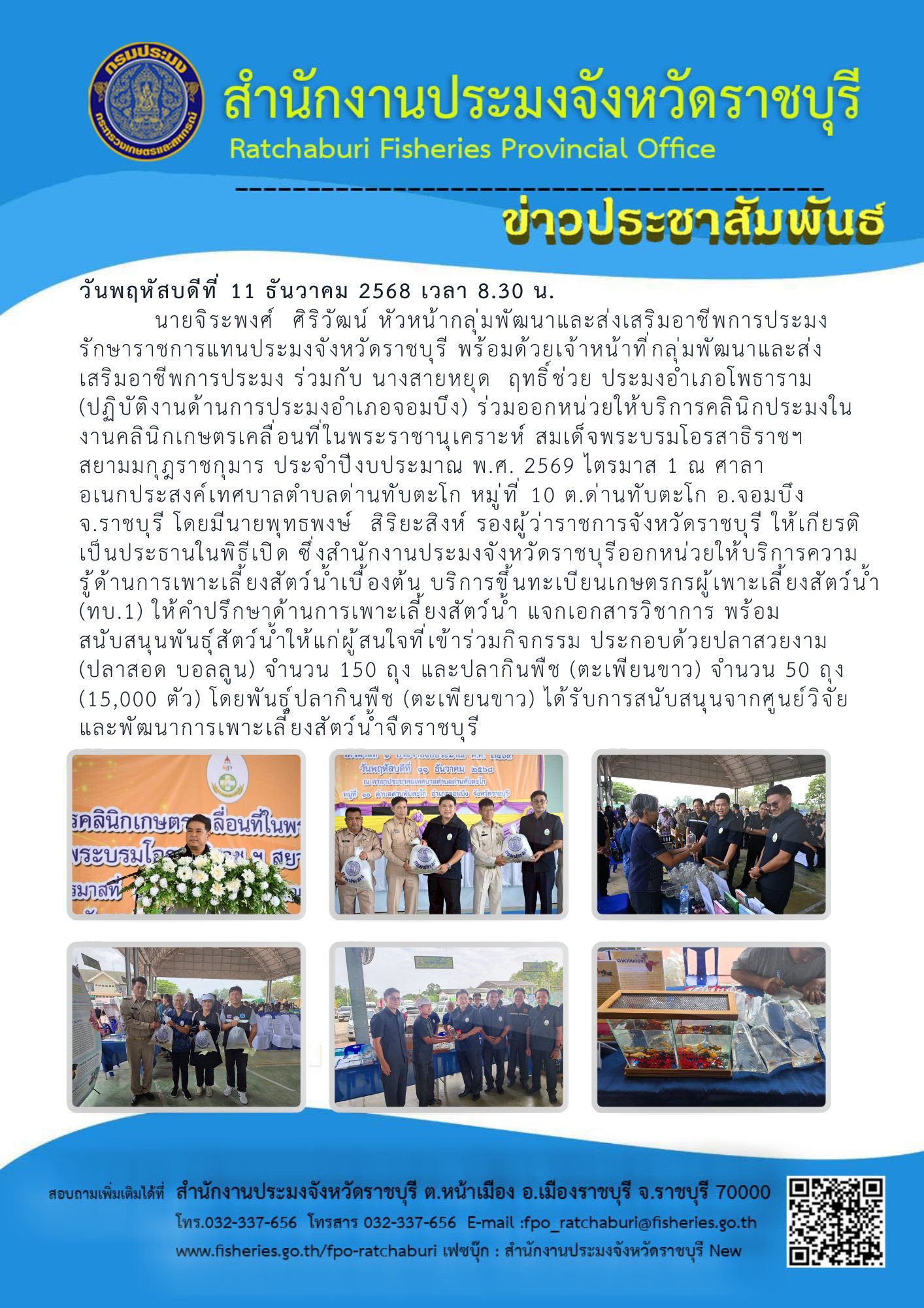 วันพฤหัสบดีที่ 11 ธันวาคม 2568 เวลา 8.30 น. นายจิระพงศ์ ศิริวัฒน์ หัวหน้ากลุ่มพัฒนาและส่งเสริมอาชีพการประมง รักษาราชการแทนประมงจังหวัดราชบุรี พร้อมด้วยเจ้าหน้าที่กลุ่มพัฒนาและส่งเสริมอาชีพการประมง ร่วมกับ นางสายหยุด ฤทธิ์ช่วย ประมงอำเภอโพธาราม (ปฏิบัติงานด้านการประมงอำเภอจอมบึง) ร่วมออกหน่วยให้บริการคลินิกประมงในงานคลินิกเกษตรเคลื่อนที่ในพระราชานุเคราะห์ สมเด็จพระบรมโอรสาธิราชฯ สยามมกุฎราชกุมาร ประจำปีงบประมาณ พ.ศ. 2569 ไตรมาส 1 ณ ศาลาอเนกประสงค์เทศบาลตำบลด่านทับตะโก หมู่ที่ 10 ต.ด่านทับตะโก อ.จอมบึง จ.ราชบุรี โดยมีนายพุทธพงษ์ สิริยะสิงห์ รองผู้ว่าราชการจังหวัดราชบุรี ให้เกียรติเป็นประธานในพิธีเปิด ซึ่งสำนักงานประมงจังหวัดราชบุรีออกหน่วยให้บริการความรู้ด้านการเพาะเลี้ยงสัตว์น้ำเบื้องต้น บริการขึ้นทะเบียนเกษตรกรผู้เพาะเลี้ยงสัตว์น้ำ (ทบ.1) ให้คำปรึกษาด้านการเพาะเลี้ยงสัตว์น้ำ แจกเอกสารวิชาการ พร้อมสนับสนุนพันธุ์สัตว์น้ำให้แก่ผู้สนใจที่เข้าร่วมกิจกรรม ประกอบด้วยปลาสวยงาม (ปลาสอด บอลลูน) จำนวน 150 ถุง และปลากินพืช (ตะเพียนขาว) จำนวน 50 ถุง (15,000 ตัว) โดยพันธุ์ปลากินพืช (ตะเพียนขาว) ได้รับการสนับสนุนจากศูนย์วิจัยและพัฒนาการเพาะเลี้ยงสัตว์น้ำจืดราชบุรี