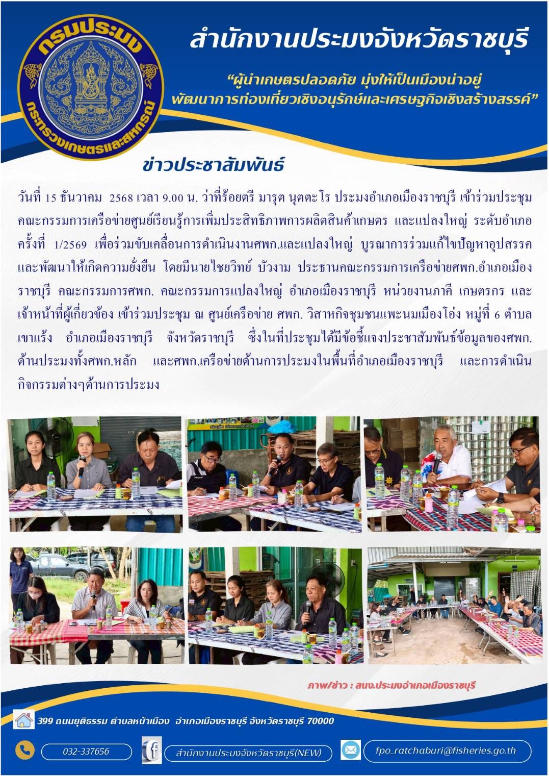 วันที่ 15 ธันวาคม 2568 เวลา 9.00 น. ว่าที่ร้อยตรี มารุต นุตตะโร ประมงอำเภอเมืองราชบุรี เข้าร่วมประชุมคณะกรรมการเครือข่ายศูนย์เรียนรู้การเพิ่มประสิทธิภาพการผลิตสินค้าเกษตร และแปลงใหญ่ ระดับอำเภอ ครั้งที่ 1/2569 เพื่อร่วมขับเคลื่อนการดำเนินงานศพก.และแปลงใหญ่ บูรณาการร่วมแก้ไขปัญหาอุปสรรค และพัฒนาให้เกิดความยั่งยืน โดยมีนายไชยวิทย์ บัวงาม ประธานคณะกรรมการเครือข่ายศพก.อำเภอเมืองราชบุรี คณะกรรมการศพก. คณะกรรมการแปลงใหญ่ อำเภอเมืองราชบุรี หน่วยงานภาคี เกษตรกร และเจ้าหน้าที่ผู้เกี่ยวข้อง เข้าร่วมประชุม ณ ศูนย์เครือข่าย ศพก. วิสาหกิจชุมชนแพะนมเมืองโอ่ง หมู่ที่ 6 ตำบลเขาแร้ง อำเภอเมืองราชบุรี จังหวัดราชบุรี ซึ่งในที่ประชุม ได้มีข้อชี้แจงประชาสัมพันธ์ข้อมูลของศพก.ด้านประมงทั้งศพก.หลัก และศพก.เครือข่ายด้านประมงในพื้นที่อำเภอเมืองราชบุรี และการดำเนินกิจกรรมต่างๆด้านประมง