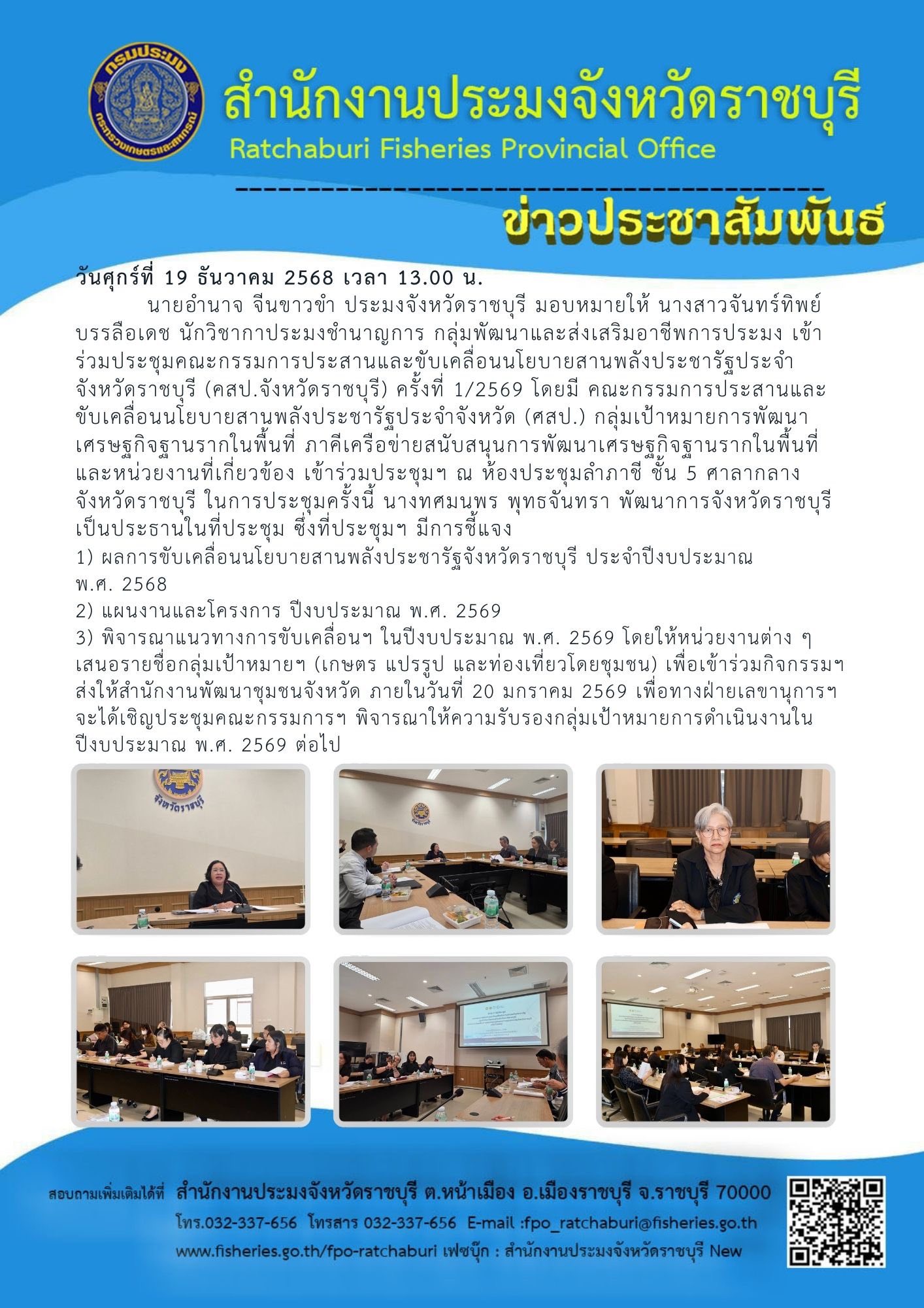 วันศุกร์ที่ 19 ธันวาคม 2568 เวลา 13.00 น. นายอำนาจ จีนขาวขำ ประมงจังหวัดราชบุรี มอบหมายให้ นางสาวจันทร์ทิพย์ บรรลือเดช นักวิชาการประมงชำนาญการ กลุ่มพัฒนาและส่งเสริมอาชีพการประมง เข้าร่วมประชุมคณะกรรมการประสานและขับเคลื่อนนโยบายสานพลังประชารัฐประจำจังหวัดราชบุรี (คสป.จังหวัดราชบุรี) ครั้งที่ 1/2569 โดยมี คณะกรรมการประสานและขับเคลื่อนนโยบายสานพลังประชารัฐประจำจังหวัด (ศสป.) กลุ่มเป้าหมายการพัฒนาเศรษฐกิจฐานรากในพื้นที่ ภาคีเครือข่ายสนับสนุนการพัฒนาเศรษฐกิจฐานรากในพื้นที่ และหน่วยงานที่เกี่ยวข้อง เข้าร่วมประชุมฯ ณ ห้องประชุมลำภาชี ชั้น 5 ศาลากลางจังหวัดราชบุรี ในการประชุมครั้งนี้ นางทศมนพร พุทธจันทรา พัฒนาการจังหวัดราชบุรี เป็นประธานในที่ประชุม ซึ่งที่ประชุมฯ มีการชี้แจง