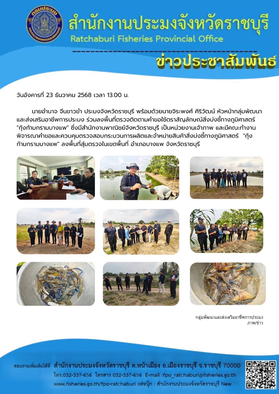 วันอังคารที่ 23 ธันวาคม 2568 เวลา 13.00 น. นายอำนาจ จีนขาวขำ ประมงจังหวัดราชบุรี พร้อมด้วยนายจิระพงศ์ ศิริวัฒน์ หัวหน้ากลุ่มพัฒนาและส่งเสริมอาชีพการประมง ร่วมลงพื้นที่ตรวจติดตามคำขอใช้ตราสัญลักษณ์สิ่งบ่งชี้ทางภูมิศาสตร์ "กุ้งก้ามกรามบางแพ" ซึ่งมีสำนักงานพาณิชย์จังหวัดราชบุรี เป็นหน่วยงานเจ้าภาพ และมีคณะทำงานพิจารณาคำขอและควบคุมตรวจสอบกระบวนการผลิตและจำหน่ายสินค้าสิ่งบ่งชี้ทางภูมิศาสตร์ "กุ้งก้ามกรามบางแพ" ลงพื้นที่สุ่มตรวจในเขตพื้นที่ อำเภอบางแพ จังหวัดราชบุรี