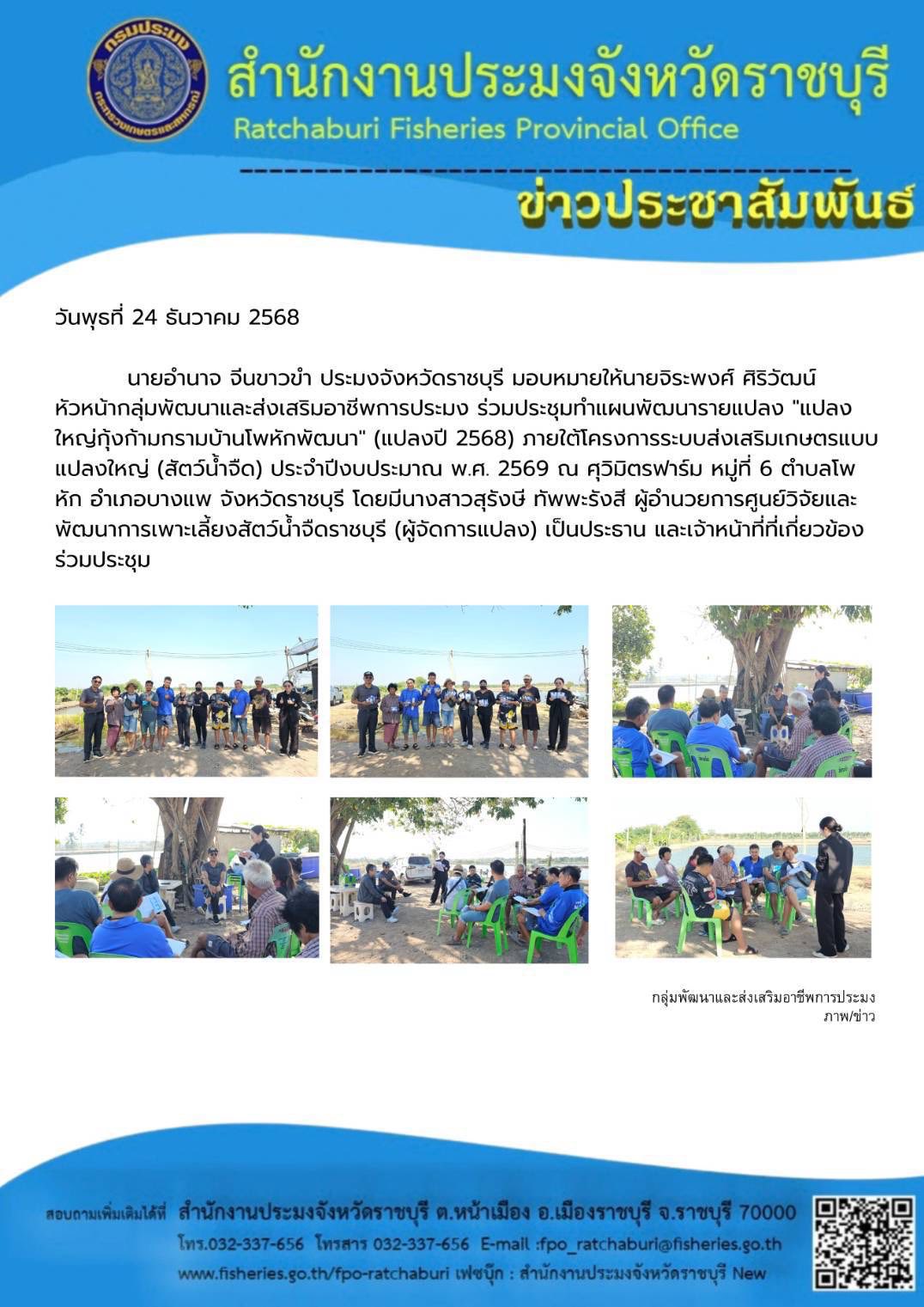 วันพุธที่ 24 ธันวาคม 2568 นายอำนาจ จีนขาวขำ ประมงจังหวัดราชบุรี มอบหมายให้นายจิระพงศ์ ศิริวัฒน์ หัวหน้ากลุ่มพัฒนาและส่งเสริมอาชีพการประมง ร่วมประชุมทำแผนพัฒนารายแปลง "แปลงใหญ่กุ้งก้ามกรามบ้านโพหักพัฒนา" (แปลงปี 2568) ภายใต้โครงการระบบส่งเสริมเกษตรแบบแปลงใหญ่ (สัตว์น้ำจืด) ประจำปีงบประมาณ พ.ศ. 2569 ณ ศุวิมิตรฟาร์ม หมู่ที่ 6 ตำบลโพหัก อำเภอบางแพ จังหวัดราชบุรี โดยมีนางสาวสุรังษี ทัพพะรังสี ผู้อำนวยการศูนย์วิจัยและพัฒนาการเพาะเลี้ยงสัตว์น้ำจืดราชบุรี (ผู้จัดการแปลง) เป็นประธาน และเจ้าหน้าที่ที่เกี่ยวข้องร่วมประชุมฯ