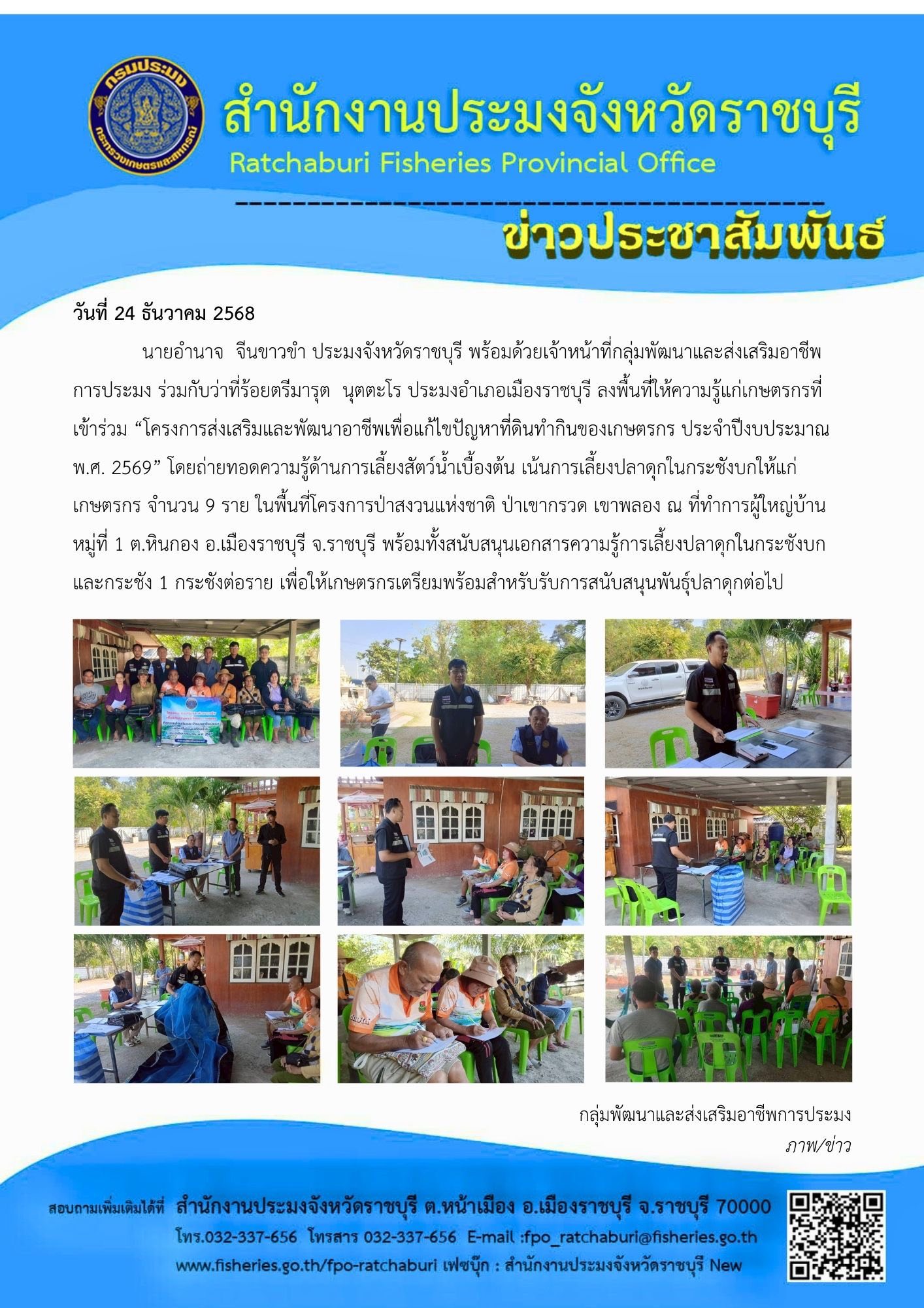 วันที่ 24 ธันวาคม 2568 นายอำนาจ จีนขาวขำ ประมงจังหวัดราชบุรี พร้อมด้วยเจ้าหน้าที่กลุ่มพัฒนาและส่งเสริมอาชีพการประมง ร่วมกับว่าที่ร้อยตรีมารุต นุตตะโร ประมงอำเภอเมืองราชบุรี ลงพื้นที่ให้ความรู้แก่เกษตรกรที่เข้าร่วม “โครงการส่งเสริมและพัฒนาอาชีพเพื่อแก้ไขปัญหาที่ดินทำกินของเกษตรกร ประจำปีงบประมาณ พ.ศ. 2569” โดยถ่ายทอดความรู้ด้านการเลี้ยงสัตว์น้ำเบื้องต้น เน้นการเลี้ยงปลาดุกในกระชังบกให้แก่เกษตรกร จำนวน 9 ราย ในพื้นที่โครงการป่าสงวนแห่งชาติ ป่าเขากรวด เขาพลอง ณ ที่ทำการผู้ใหญ่บ้าน หมู่ที่ 1 ต.หินกอง อ.เมืองราชบุรี จ.ราชบุรี พร้อมทั้งสนับสนุนเอกสารความรู้การเลี้ยงปลาดุกในกระชังบก และกระชัง 1 กระชังต่อราย เพื่อให้เกษตรกรเตรียมพร้อมสำหรับรับการสนับสนุนพันธุ์ปลาดุกต่อไป