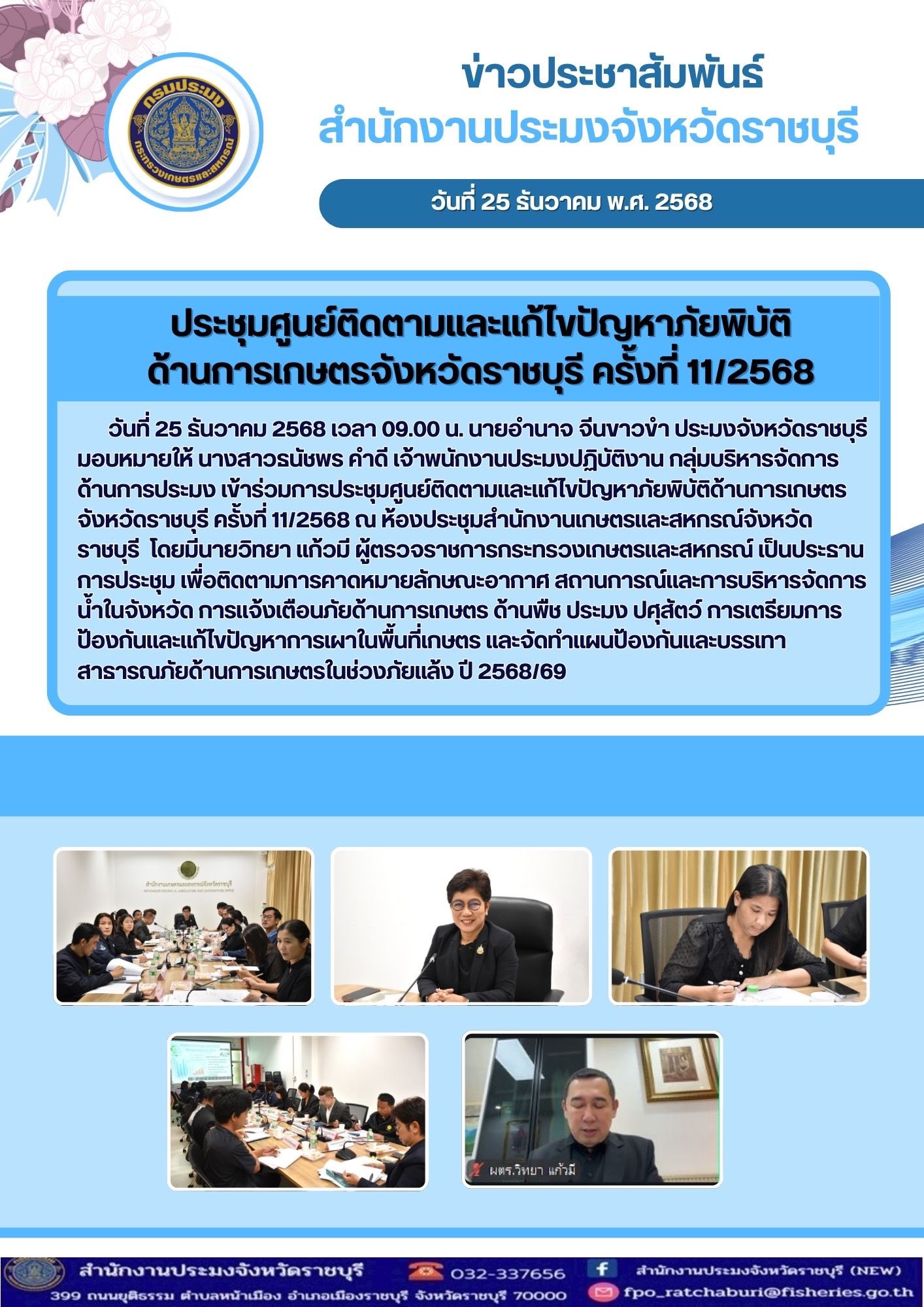 วันที่ 25 ธันวาคม 2568 เวลา 09.00 น. นายอำนาจ จีนขาวขำ ประมงจังหวัดราชบุรี มอบหมายให้ นางสาวธนัชพร คำดี เจ้าพนักงานประมงปฏิบัติงาน กลุ่มบริหารจัดการด้านการประมง เข้าร่วมการประชุมศูนย์ติดตามและแก้ไขปัญหาภัยพิบัติด้านการเกษตรจังหวัดราชบุรี ครั้งที่ 11/2568 ณ ห้องประชุมสำนักงานเกษตรและสหกรณ์จังหวัดราชบุรี โดยมีนายวิทยา แก้วมี ผู้ตรวจราชการกระทรวงเกษตรและสหกรณ์ เป็นประธานการประชุม เพื่อติดตามการคาดหมายลักษณะอากาศ สถานการณ์และการบริหารจัดการน้ำในจังหวัด การแจ้งเตือนภัยด้านการเกษตร ด้านพืช ประมง ปศุสัตว์ การเตรียมการป้องกันและแก้ไขปัญหาการเผาในพื้นที่เกษตร และจัดทำแผนป้องกันและบรรเทาสาธารณภัยด้านการเกษตรในช่วงภัยแล้ง ปี 2568/69