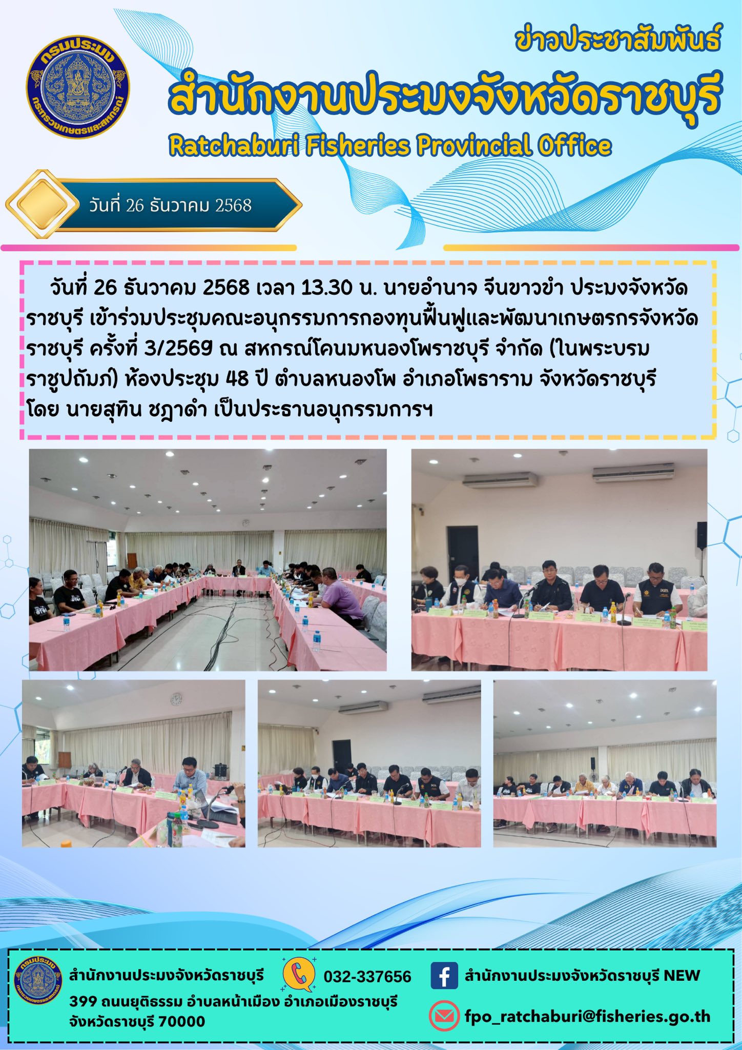 วันที่ 26 ธันวาคม 2568 เวลา 13.30 น. นายอำนาจ จีนขาวขำ ประมงจังหวัดราชบุรี เข้าร่วมประชุมคณะอนุกรรมการกองทุนฟื้นฟูและพัฒนาเกษตรกรจังหวัดราชบุรี ครั้งที่ 3/2569 ณ สหกรณ์โคนมหนองโพราชบุรี จำกัด (ในพระบรมราชูปถัมภ์) ห้องประชุม 48 ปี ตำบลหนองโพ อำเภอโพธาราม จังหวัดราชบุรี โดย นายสุทิน ชฎาดำ เป็นประธานอนุกรรมการฯ