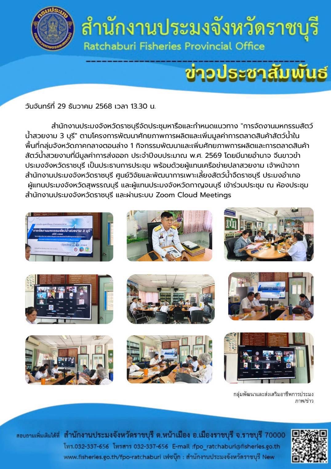 วันจันทร์ที่ 29 ธันวาคม 2568 เวลา 13.30 น. สำนักงานประมงจังหวัดราชบุรี จัดประชุมหารือและกำหนดแนวทาง "การจัดงานมหกรรมสัตว์น้ำสวยงาม 3 บุรี" ตามโครงการพัฒนาศักยภาพการผลิตและเพิ่มมูลค่าการตลาดสินค้าสัตว์น้ำในพื้นที่กลุ่มจังหวัดภาคกลางตอนล่าง 1 กิจกรรมพัฒนาและเพิ่มศักยภาพการผลิตและการตลาดสินค้าสัตว์น้ำสวยงามที่มีมูลค่าการส่งออก ประจำปีงบประมาณ พ.ศ. 2569 โดยมีนายอำนาจ จีนขาวขำ ประมงจังหวัดราชบุรี เป็นประธานการประชุม พร้อมด้วยผู้แทนเครือข่ายปลาสวยงาม เจ้าหน้าจากสำนักงานประมงจังหวัดราชบุรี ศูนย์วิจัยและพัฒนาการเพาะเลี้ยงสัตว์น้ำจืดราชบุรี ประมงอำเภอ ผู้แทนประมงจังหวัดสุพรรณบุรี และผู้แทนประมงจังหวัดกาญจนบุรี เข้าร่วมประชุม ณ ห้องประชุมสำนักงานประมงจังหวัดราชบุรี และผ่านระบบ Zoom Cloud Meetings