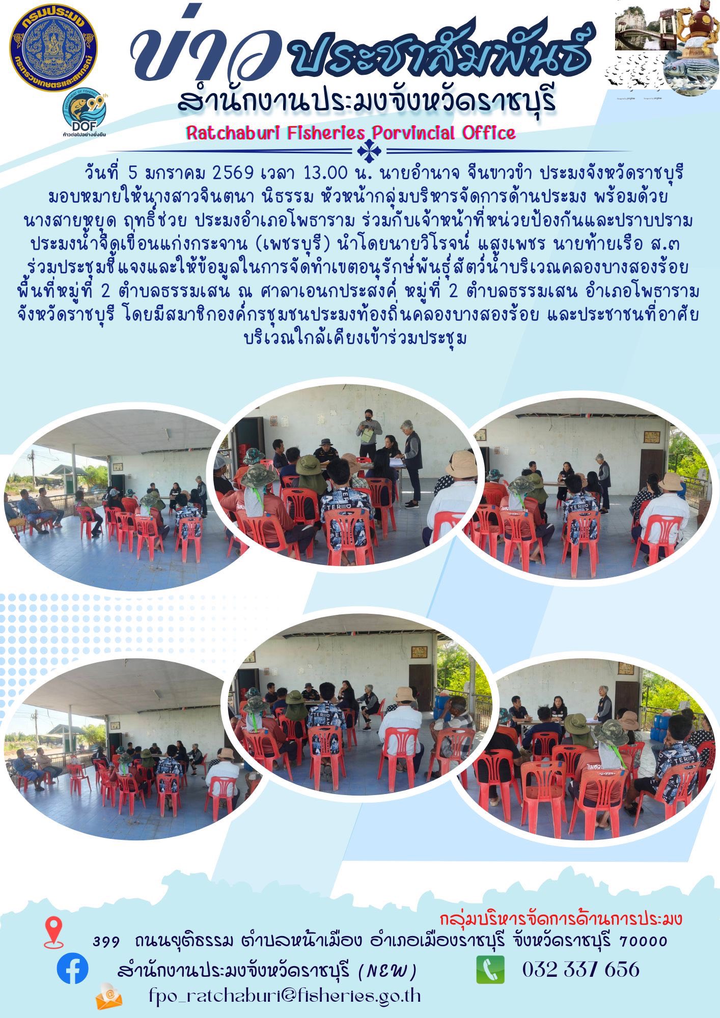 วันที่ 5 มกราคม 2569 เวลา 13.00 น. นายอำนาจ จีนขาวขำ ประมงจังหวัดราชบุรี มอบหมายให้นางสาวจินตนา นิธรรม หัวหน้ากลุ่มบริหารจัดการด้านประมง พร้อมด้วยนางสายหยุด ฤทธิ์ช่วย ประมงอำเภอโพธาราม ร่วมกับเจ้าหน้าที่หน่วยป้องกันและปราบปรามประมงน้ำจืดเขื่อนแก่งกระจาน (เพชรบุรี) นำโดยนายวิโรจน์ แสงเพชรนายท้ายเรือ ส.๓ ร่วมประชุมชี้แจงและให้ข้อมูลในการจัดทำเขตอนุรักษ์พันธุ์สัตว์น้ำบริเวณคลองบางสองร้อย พื้นที่หมู่ที่ 2 ตำบลธรรมเสน ณ ศาลาเอนกประสงค์ หมู่ที่ 2 ตำบลธรรมเสน อำเภอโพธาราม จังหวัดราชบุรี โดยมีสมาชิกองค์กรชุมชนประมงท้องถิ่นคลองบางสองร้อย และประชาชนที่อาศัยบริเวณใกล้เคียงเข้าร่วมประชุม