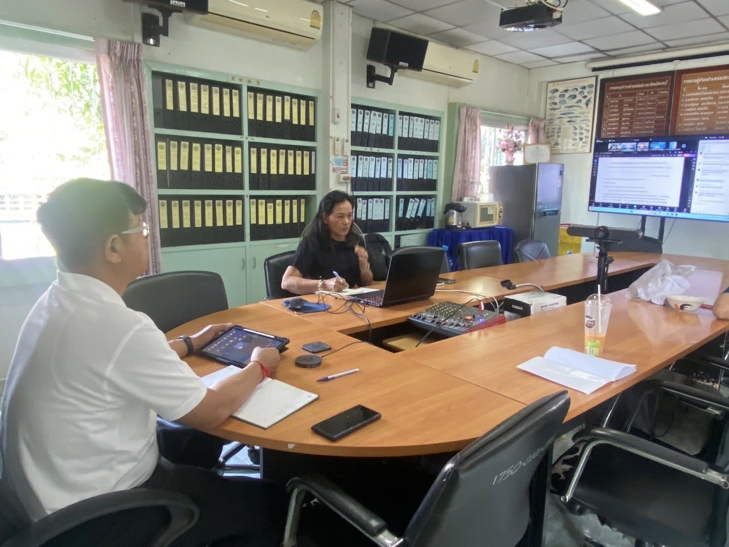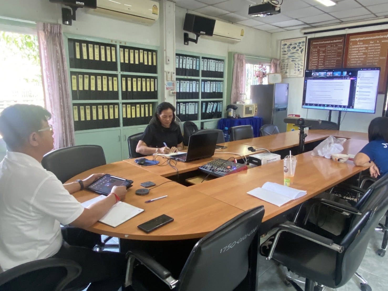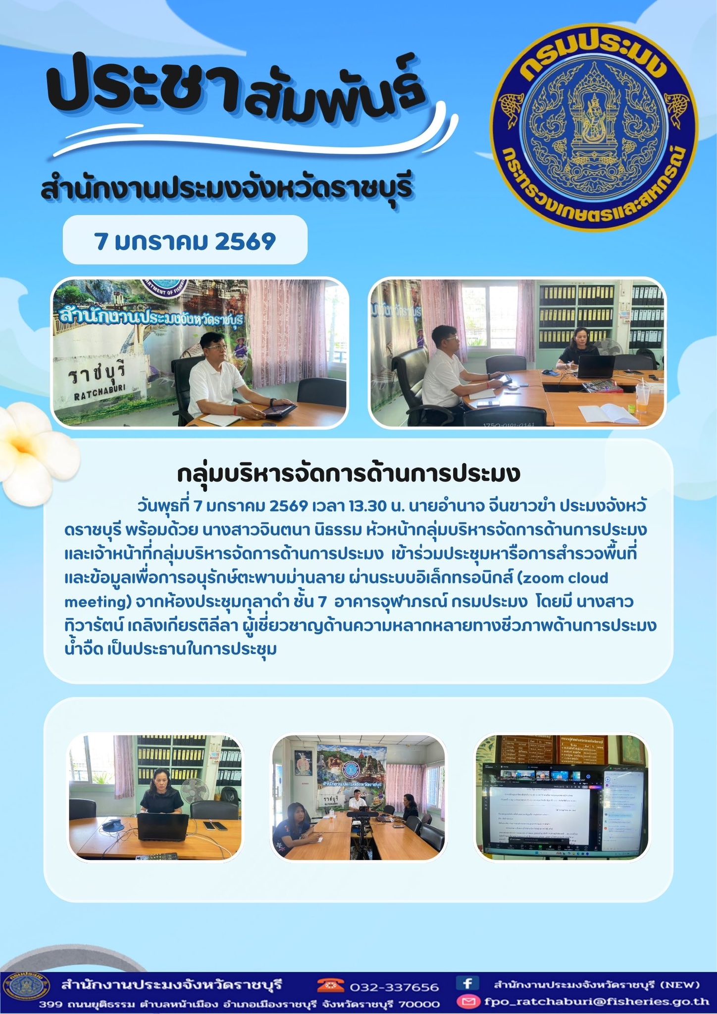 วันพุธที่ 7 มกราคม 2569 เวลา 13.30 น. นายอำนาจ จีนขาวขำ ประมงจังหวัดราชบุรี พร้อมด้วย นางสาวจินตนา นิธรรม หัวหน้ากลุ่มบริหารจัดการด้านการประมง และเจ้าหน้าที่กลุ่มบริหารจัดการด้านการประมง เข้าร่วมประชุมหารือการสำรวจพื้นที่และข้อมูลเพื่อการอนุรักษ์ตะพาบม่านลาย ผ่านระบบอิเล็กทรอนิกส์ (zoom cloud meeting) จากห้องประชุมกุลาดำ ชั้น 7 อาคารจุฬาภรณ์ กรมประมง โดยมี นางสาวทิวารัตน์ เถลิงเกียรติลีลา ผู้เชี่ยวชาญด้านความหลากหลายทางชีวภาพด้านการประมงน้ำจืด เป็นประธานในการประชุม