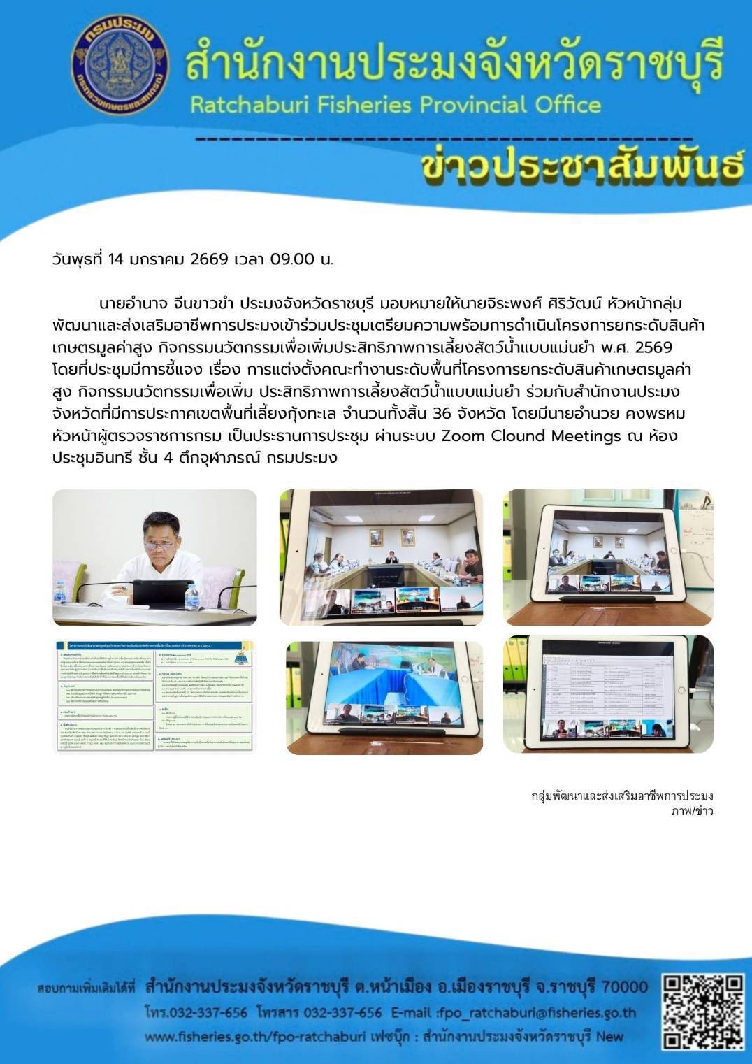 วันพุธที่ 14 มกราคม 2669 เวลา 09.00 น. นายอำนาจ จีนขาวขำ ประมงจังหวัดราชบุรี มอบหมายให้นายจิระพงศ์ ศิริวัฒน์ หัวหน้ากลุ่มพัฒนาและส่งเสริมอาชีพการประมง เข้าร่วมประชุมเตรียมความพร้อมการดำเนินโครงการยกระดับสินค้าเกษตรมูลค่าสูง กิจกรรมนวัตกรรมเพื่อเพิ่มประสิทธิภาพการเลี้ยงสัตว์น้ำแบบแม่นยำ พ.ศ. 2569 โดยที่ประชุมมีการชี้แจง เรื่อง การแต่งตั้งคณะทำงานระดับพื้นที่โครงการยกระดับสินค้าเกษตรมูลค่าสูง กิจกรรมนวัตกรรมเพื่อเพิ่ม ประสิทธิภาพการเลี้ยงสัตว์น้ำแบบแม่นยำ ร่วมกับสำนักงานประมงจังหวัดที่มีการประกาศเขตพื้นที่เลี้ยงกุ้งทะเล จำนวนทั้งสิ้น 36 จังหวัด โดยมีนายอำนวย คงพรหม หัวหน้าผู้ตรวจราชการกรม เป็นประธานการประชุม ผ่านระบบ Zoom Clound Meetings ณ ห้องประชุมอินทรี ชั้น 4 ตึกจุฬาภรณ์ กรมประมง