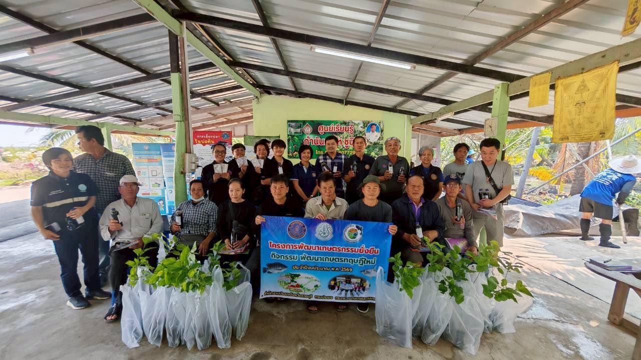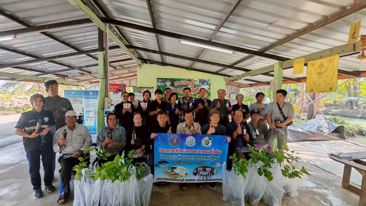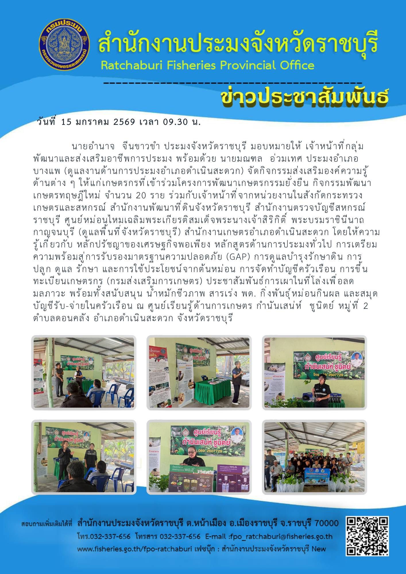 วันที่ 15 มกราคม 2569 เวลา 09.30 น. นายอำนาจ จีนขาวขำ ประมงจังหวัดราชบุรี มอบหมายให้ เจ้าหน้าที่กลุ่มพัฒนาและส่งเสริมอาชีพการประมง พร้อมด้วย นายมณฑล อ่วมเทศ ประมงอำเภอบางแพ (ดูแลงานด้านการประมงอำเภอดำเนินสะดวก) จัดกิจกรรมส่งเสริมองค์ความรู้ด้านต่าง ๆ ให้แก่เกษตรกรที่เข้าร่วมโครงการพัฒนาเกษตรกรรมยั่งยืน กิจกรรมพัฒนาเกษตรทฤษฎีใหม่ จำนวน 20 ราย ร่วมกับเจ้าหน้าที่จากหน่วยงานในสังกัดกระทรวงเกษตรและสหกรณ์ สำนักงานพัฒนาที่ดินจังหวัดราชบุรี สำนักงานตรวจบัญชีสหกรณ์ราชบุรี ศูนย์หม่อนไหมเฉลิมพระเกียรติสมเด็จพระนางเจ้าสิริกิติ์ พระบรมราชินีนาถ กาญจนบุรี (ดูแลพื้นที่จังหวัดราชบุรี) สำนักงานเกษตรอำเภอดำเนินสะดวก โดยให้ความรู้เกี่ยวกับ หลักปรัชญาของเศรษฐกิจพอเพียง หลักสูตรด้านการประมงทั่วไป การเตรียมความพร้อมสู่การรับรองมาตรฐานความปลอดภัย (GAP) การดูแลบำรุงรักษาดิน การปลูก ดูแล รักษา และการใช้ประโยชน์จากต้นหม่อน การจัดทำบัญชีครัวเรือน การขึ้นทะเบียนเกษตรกร (กรมส่งเสริมการเกษตร) ประชาสัมพันธ์การเผาในที่โล่งเพื่อลดมลภาวะ พร้อมทั้งสนับสนุน น้ำหมักชีวภาพ สารเร่ง พด. กิ่งพันธุ์หม่อนกินผล และสมุดบัญชีรับ-จ่ายในครัวเรือน ณ ศูนย์เรียนรู้ด้านการเกษตร กำนันเสน่ห์ ชูนิตย์ หมู่ที่ 2 ตำบลดอนคลัง อำเภอดำเนินสะดวก จังหวัดราชบุรี