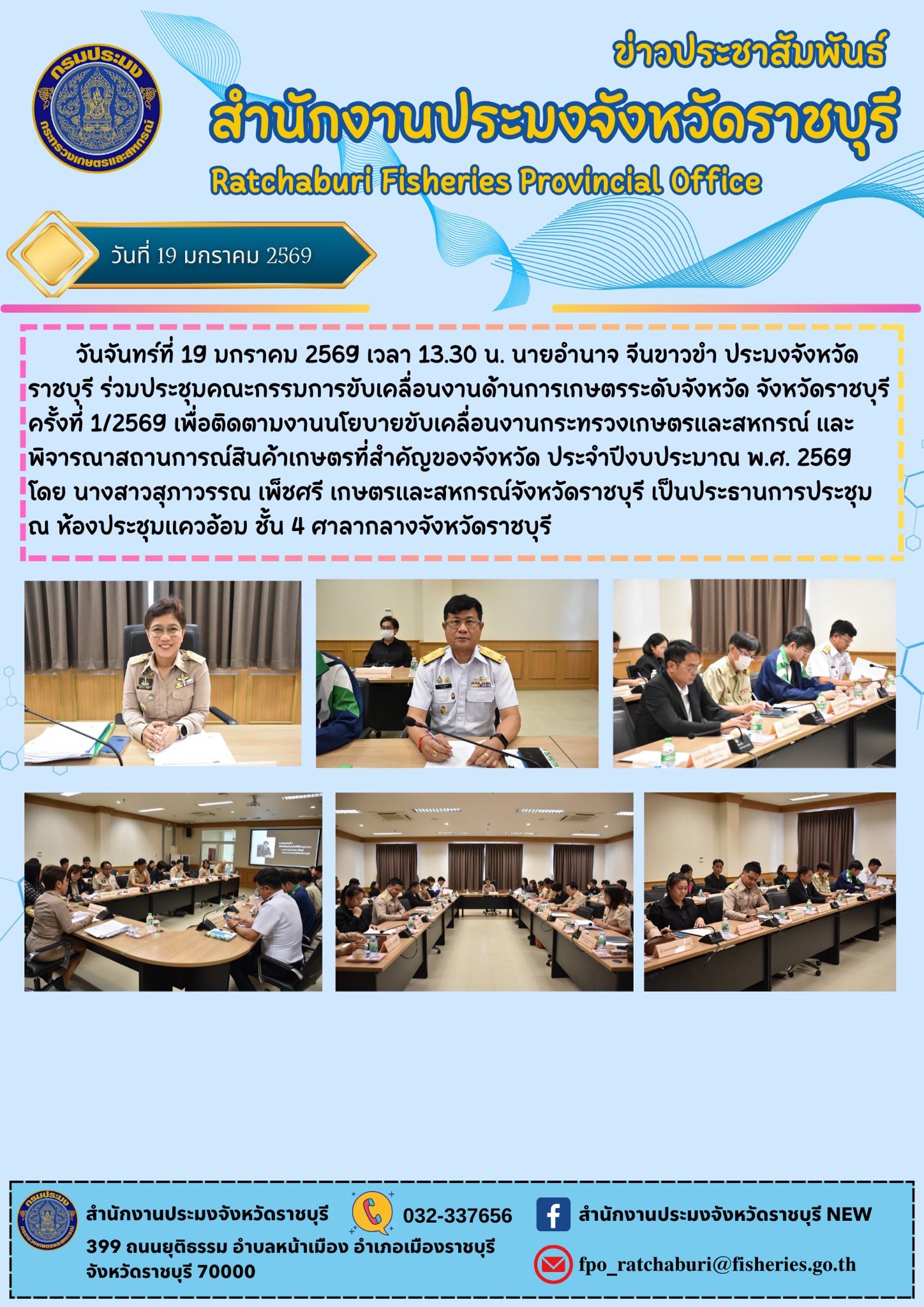 วันจันทร์ที่ 19 มกราคม 2569 เวลา 13.30 น. นายอำนาจ จีนขาวขำ ประมงจังหวัดราชบุรี เข้าร่วมประชุมคณะกรรมการขับเคลื่อนงานด้านการเกษตรระดับจังหวัด จังหวัดราชบุรี ครั้งที่ 1/2569 เพื่อติดตามงานนโยบายขับเคลื่อนงานกระทรวงเกษตรและสหกรณ์ และพิจารณาสถานการณ์สินค้าเกษตรที่สำคัญของจังหวัด ประจำปีงบประมาณ พ.ศ. 2569 โดย นางสาวสุภาวรรณ เพ็ชศรี เกษตรและสหกรณ์จังหวัดราชบุรี เป็นประธานการประชุม ณ ห้องประชุมแควอ้อม ชั้น 4 ศาลากลางจังหวัดราชบุรี