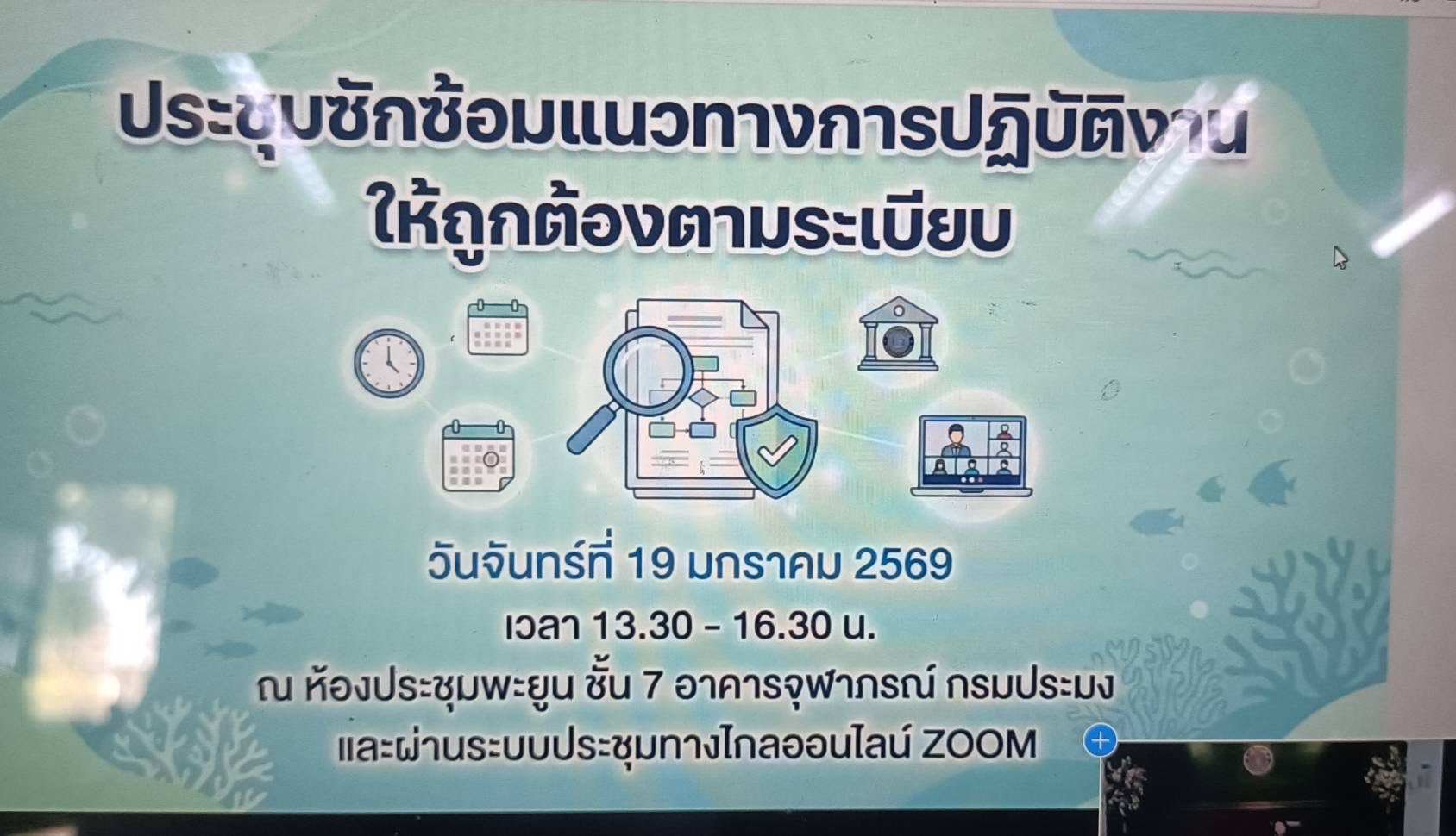 วันจันทร์ที่ 19 มกราคม 2569 เวลา 14.30 น. นายอำนาจ จีนขาวขำ ประมงจังหวัดราชบุรี มอบหมายให้นางสาวธิรารัตน์ หงษ์สงวนศรี เจ้าพนักงานธุรการชำนาญงาน สำนักงานประมงจังหวัดราชบุรี ร่วมประชุมซักซ้อมแนวทางการปฏิบัติงานให้ถูกต้องตามระเบียบ โดยมีนางฐิติพร หลาวประเสริฐ อธิบดีกรมประมง เป็นประธานเปิดการประชุม ณ ห้องประชุมกุลาดำ ชั้น 7 อาคารจุฬาภรณ์ กรมประมงและผ่านระบบประชุมทางไกลออนไลน์ Zoom