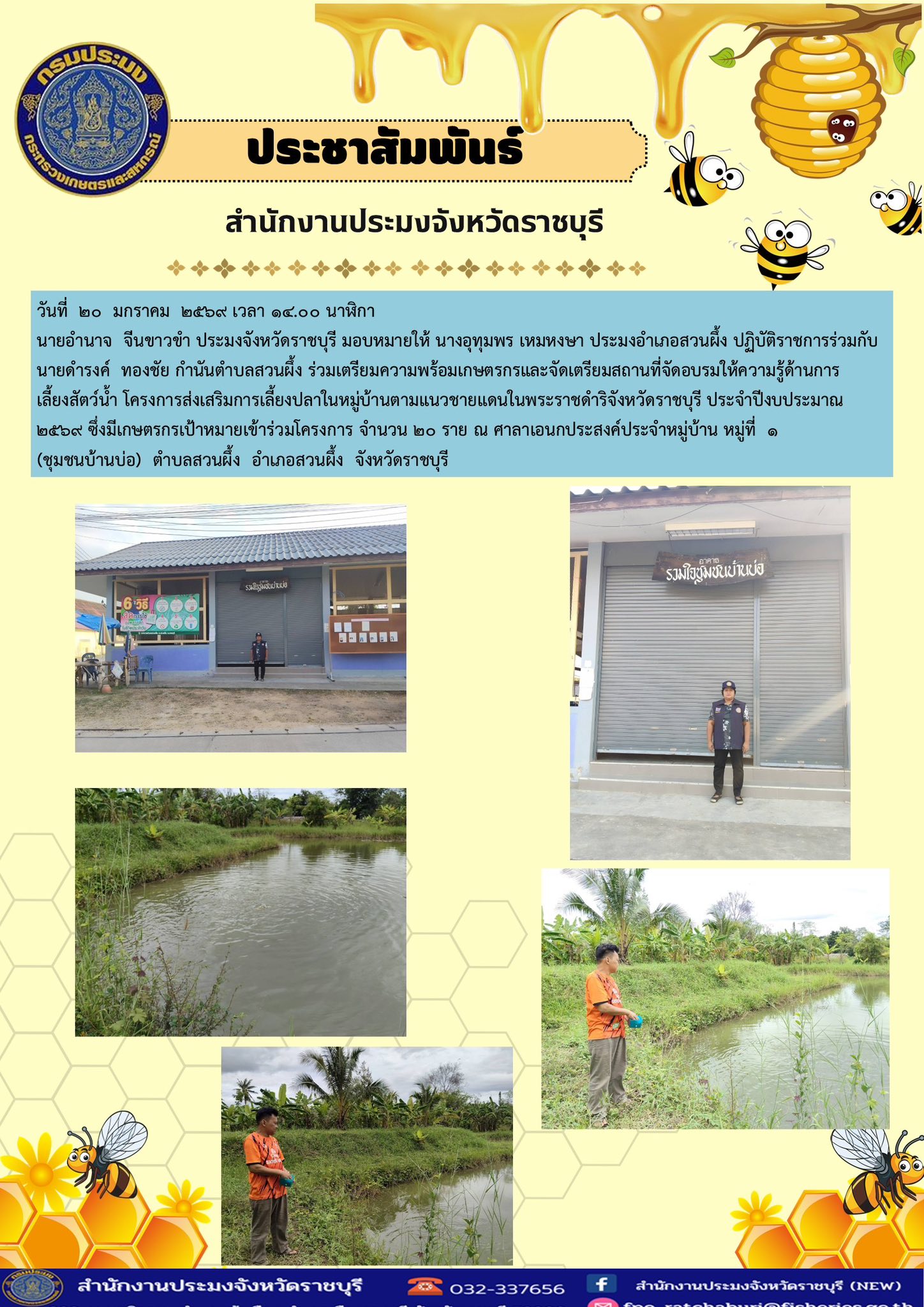 วันที่ 20 มกราคม 2569 เวลา 14.00 น. นายอำนาจ จีนขาวขำ ประมงจังหวัดราชบุรี มอบหมายให้ นางอุทุมพร เหมหงษา ประมงอำเภอสวนผึ้ง ปฏิบัติราชการร่วมกับ นายดำรงค์ ทองชัย กำนันตำบลสวนผึ้ง ร่วมเตรียมความพร้อมเกษตรกรและจัดเตรียมสถานที่จัดอบรมให้ความรู้ด้านการเลี้ยงสัตว์น้ำ โครงการส่งเสริมการเลี้ยงปลาในหมู่บ้านตามแนวชายแดนในพระราชดำริจังหวัดราชบุรี ประจำปีงบประมาณ 2569 ซึ่งมีเกษตรกรเป้าหมายเข้าร่วมโครงการ จำนวน 20 ราย ณ ศาลาเอนกประสงค์ประจำหมู่บ้าน หมู่ที่ 1 (ชุมชนบ้านบ่อ) ตำบลสวนผึ้ง อำเภอสวนผึ้ง จังหวัดราชบุรี
