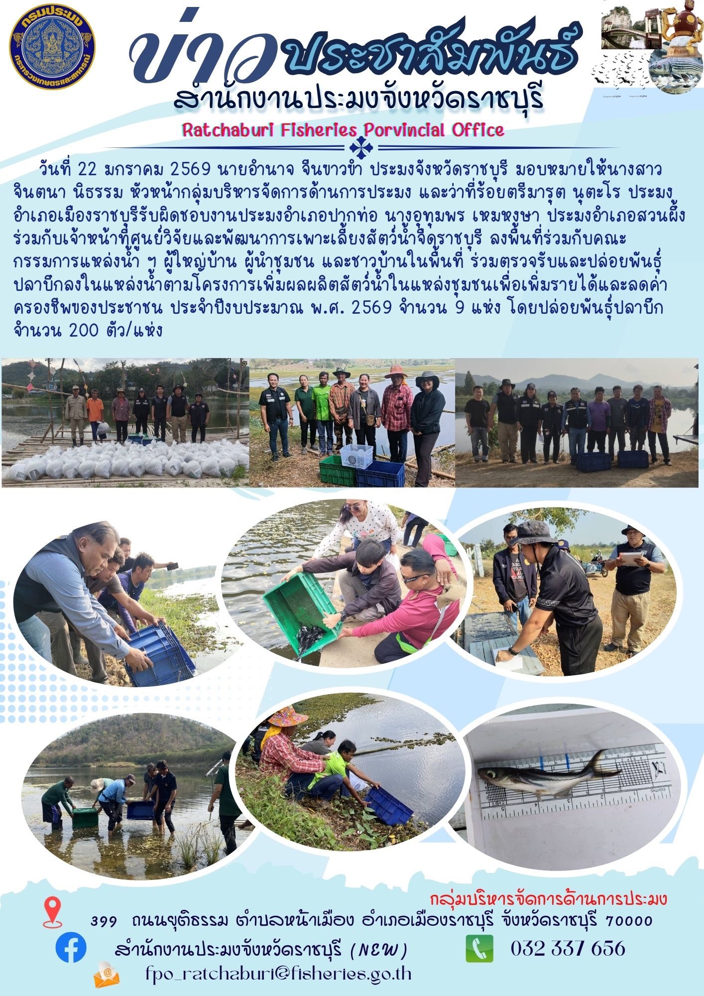 วันที่ 22 มกราคม 2569 นายอำนาจ จีนขาวขำ ประมงจังหวัดราชบุรี มอบหมายให้นางสาวจินตนา นิธรรม หัวหน้ากลุ่มบริหารจัดการด้านการประมง และว่าที่ร้อยตรีมารุต นุตะโร ประมงอำเภอเมืองราชบุรีรับผิดชอบงานประมงอำเภอปากท่อ นางอุทุมพร เหมหงษา ประมงอำเภอสวนผึ้ง ร่วมกับเจ้าหน้าที่ศูนย์วิจัยและพัฒนาการเพาะเลี้ยงสัตว์น้ำจืดราชบุรี ลงพื้นที่ร่วมกับคณะกรรมการแหล่งน้ำ ฯ ผู้ใหญ่บ้าน ผู้นำชุมชน และชาวบ้านในพื้นที่ ร่วมตรวจรับและปล่อยพันธุ์ปลาบึกลงในแหล่งน้ำตามโครงการเพิ่มผลผลิตสัตว์น้ำในแหล่งชุมชนเพื่อเพิ่มรายได้และลดค่าครองชีพของประชาชน ประจำปีงบประมาณ พ.ศ. 2569 จำนวน 9 แห่ง โดยปล่อยพันธุ์ปลาบึก จำนวน 200 ตัว/แห่ง
