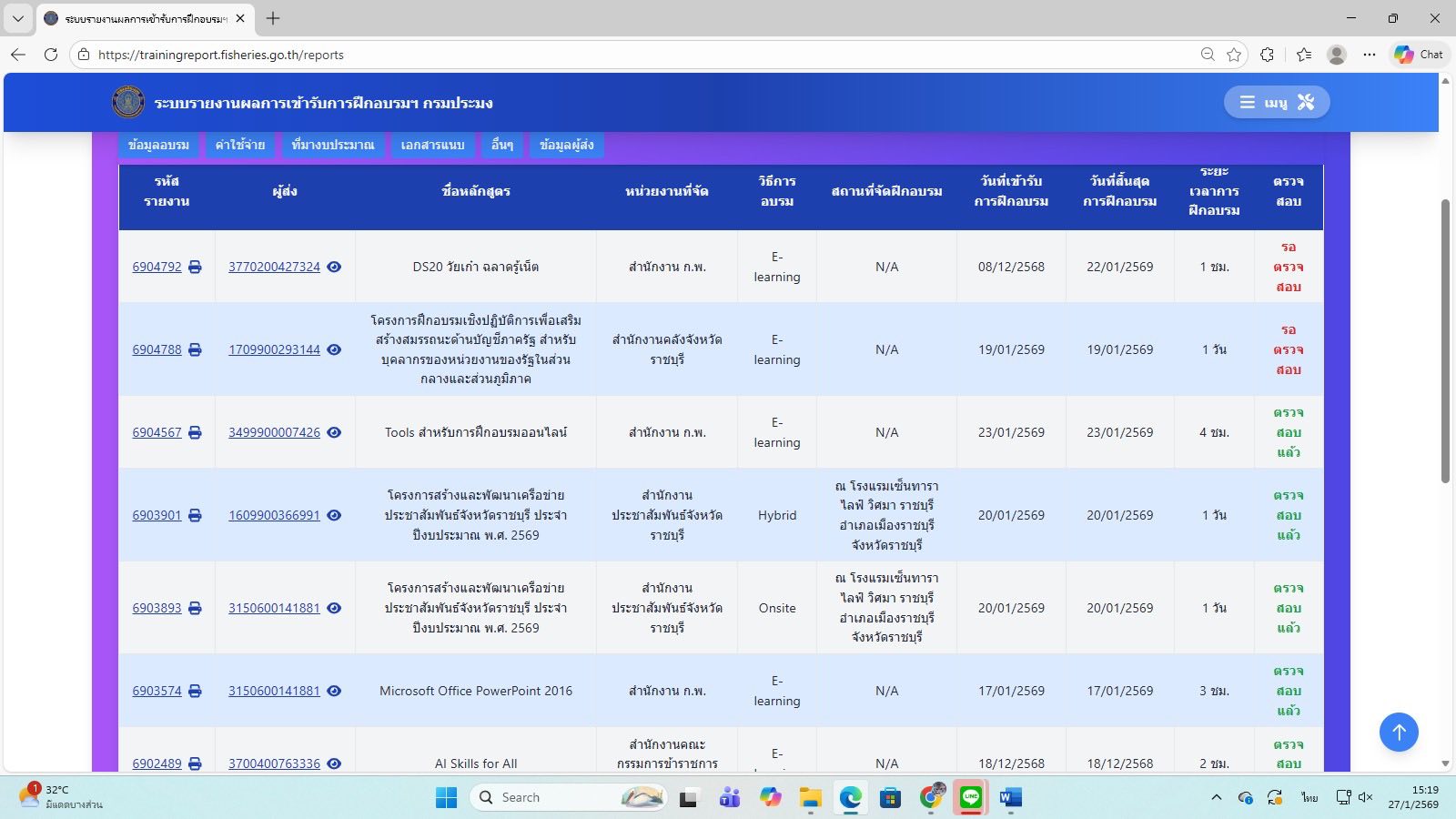 วันที่ 27 มกราคม 2569 เวลา 09.30 น. นายอำนาจ จีนขาวขำ ประมงจังหวัดราชบุรี มอบหมาย นางสาวปิยะพร เพลงสันเทียะ หัวหน้ากลุ่มบริหารและยุทธศาสตร์ เข้าร่วมการประชุมชี้แจงระบบรายงานผลการฝึกอบรมที่จัดโดยหน่วยงานภายนอก (กบค.1) กรมประมง สำหรับผู้ตรวจสอบของหน่วยงาน (Approver) ผ่านระบบ ZOOM Cloud Meeting ณ ห้องประชุมเสือตอ ศูนย์เทคโนโลยีสารสนเทศและการสื่อสาร กรมประมง