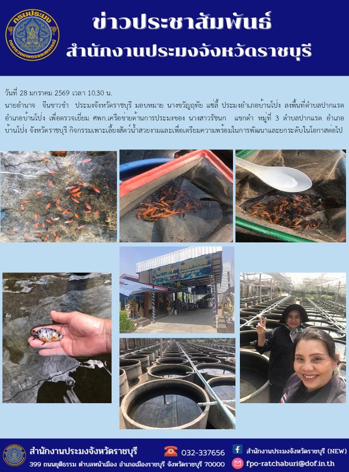 วันที่ 28 มกราคม 2569 นายอำนาจ จีนขาวขำ ประมงจังหวัดราชบุรี มอบหมาย นางขวัญฤทัย แซ่ลี้ ประมงอำเภอบ้านโป่ง ลงพื้นที่ตำบลปากแรต อำเภอบ้านโป่ง เพื่อ ตรวจเยี่ยม ศพก.เครือข่ายด้านการประมง ของนางสาวรัชนก แขกดำ หมู่ 3 ตำบลปากแรต อำเภอบ้านโป่ง จังหวัดราชบุรี กิจกรรมเพาะเลี้ยงสัตว์น้ำสวยงาม และเพื่อเตรียมความพร้อมในการพัฒนาและยกระดับ ศพก. ในโอกาสต่อไป